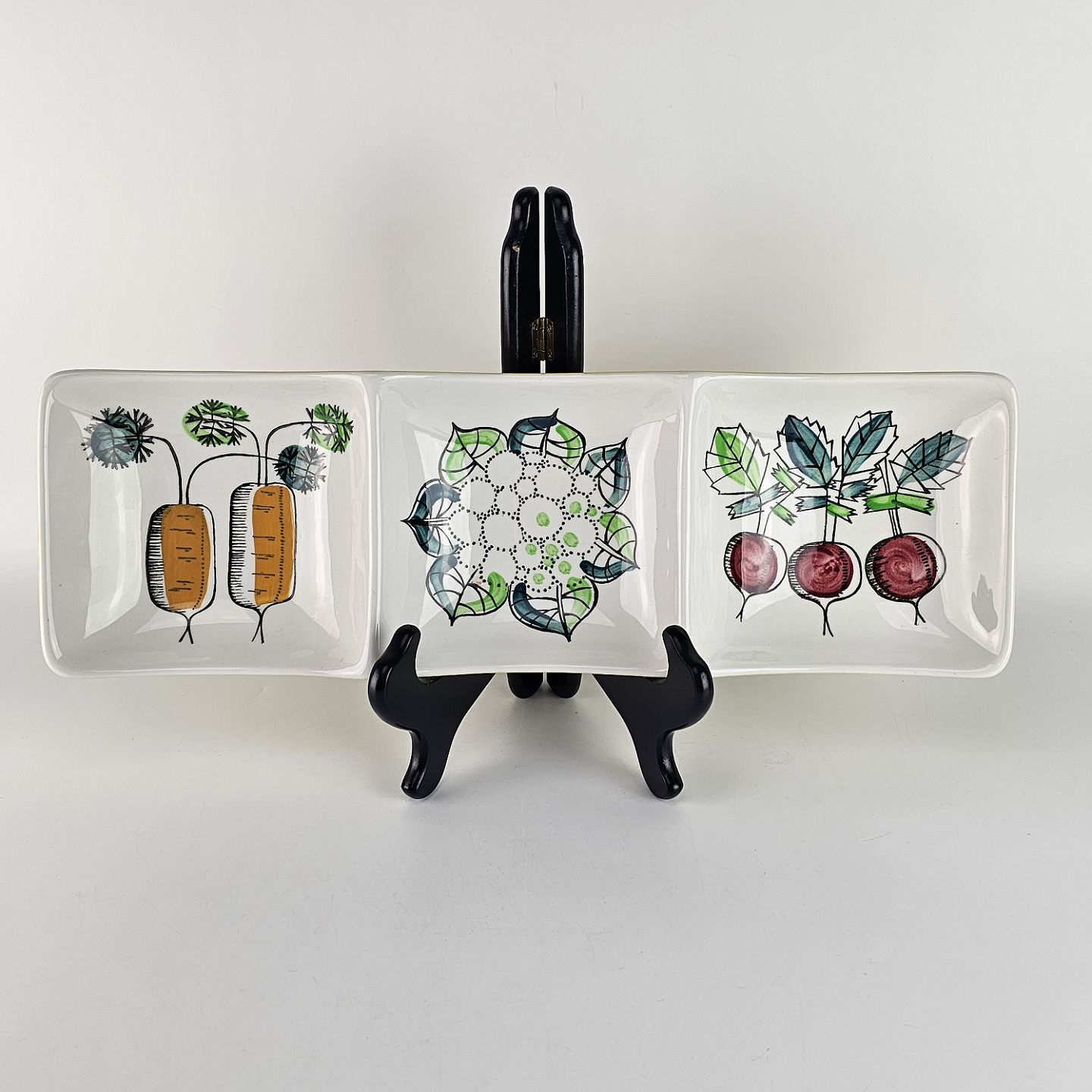 Aflangt tredelt fad i fajance fra stellet My garden. Stellet er fremstillet i 1960'erne. Nr. 71G