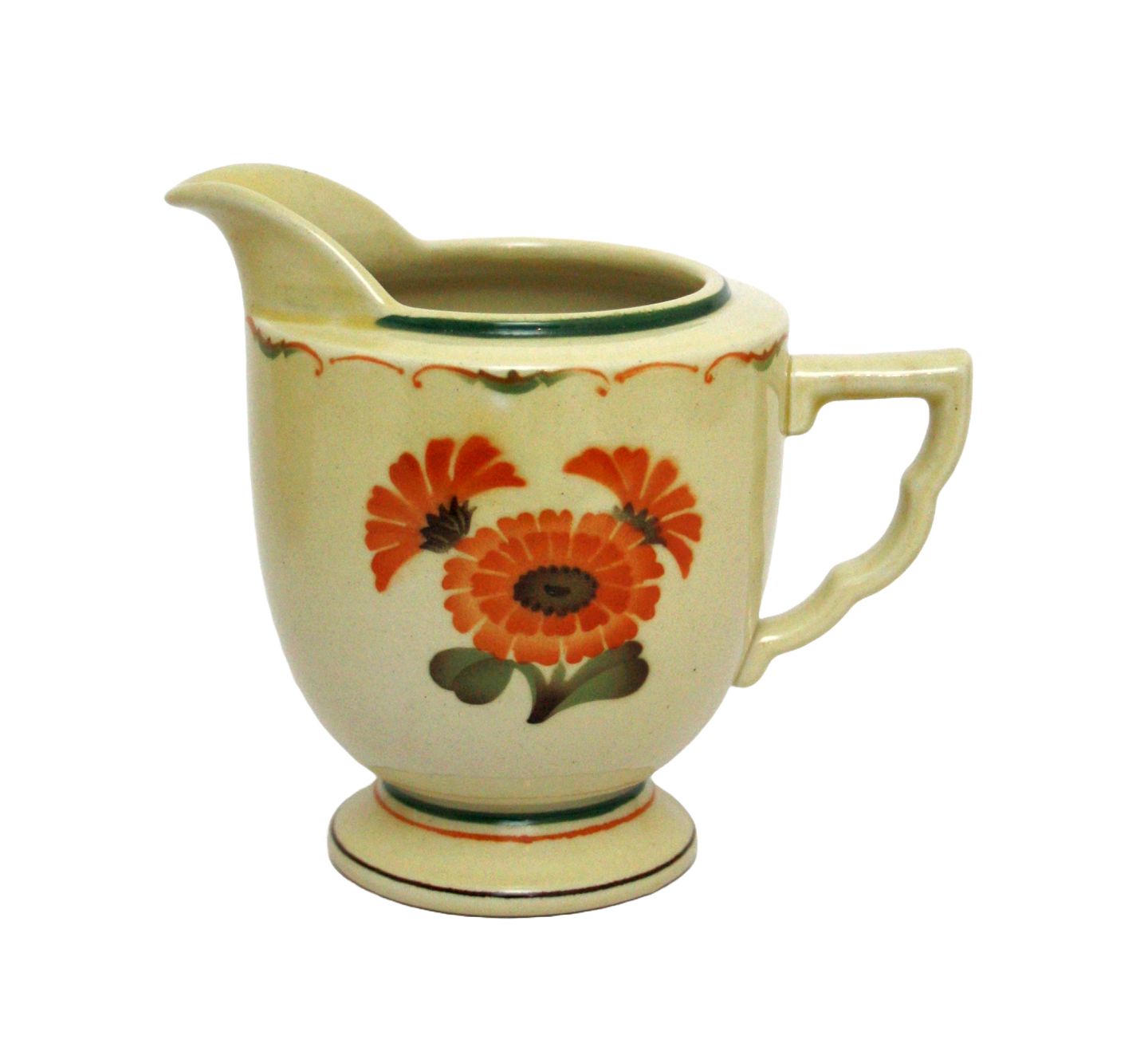 Text available in Danish: Aluminia, Morgenfrue. Designet af Niels Thorsson. Produceret i perioden 1934-1967. Luftmalet. Flødekande med funkishank. Højde 10 cm. Længde 11,5 cm. Flot stand. Pris: 150 kr. stk. Lager: 1