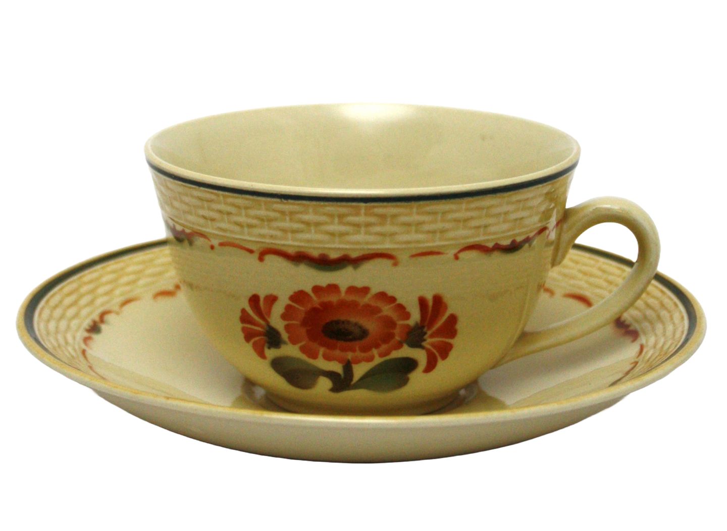 Text available in Danish: Aluminia, Morgenfrue. Designet af Niels Thorsson. Produceret i perioden 1934-1967. Luftmalet. Tekop. Nr. 1782. Højde 5,5 cm. Diameter 9,5 cm. Underkop diameter 15 cm. Flot stand. Pris: 150 kr. stk. Lager: 7