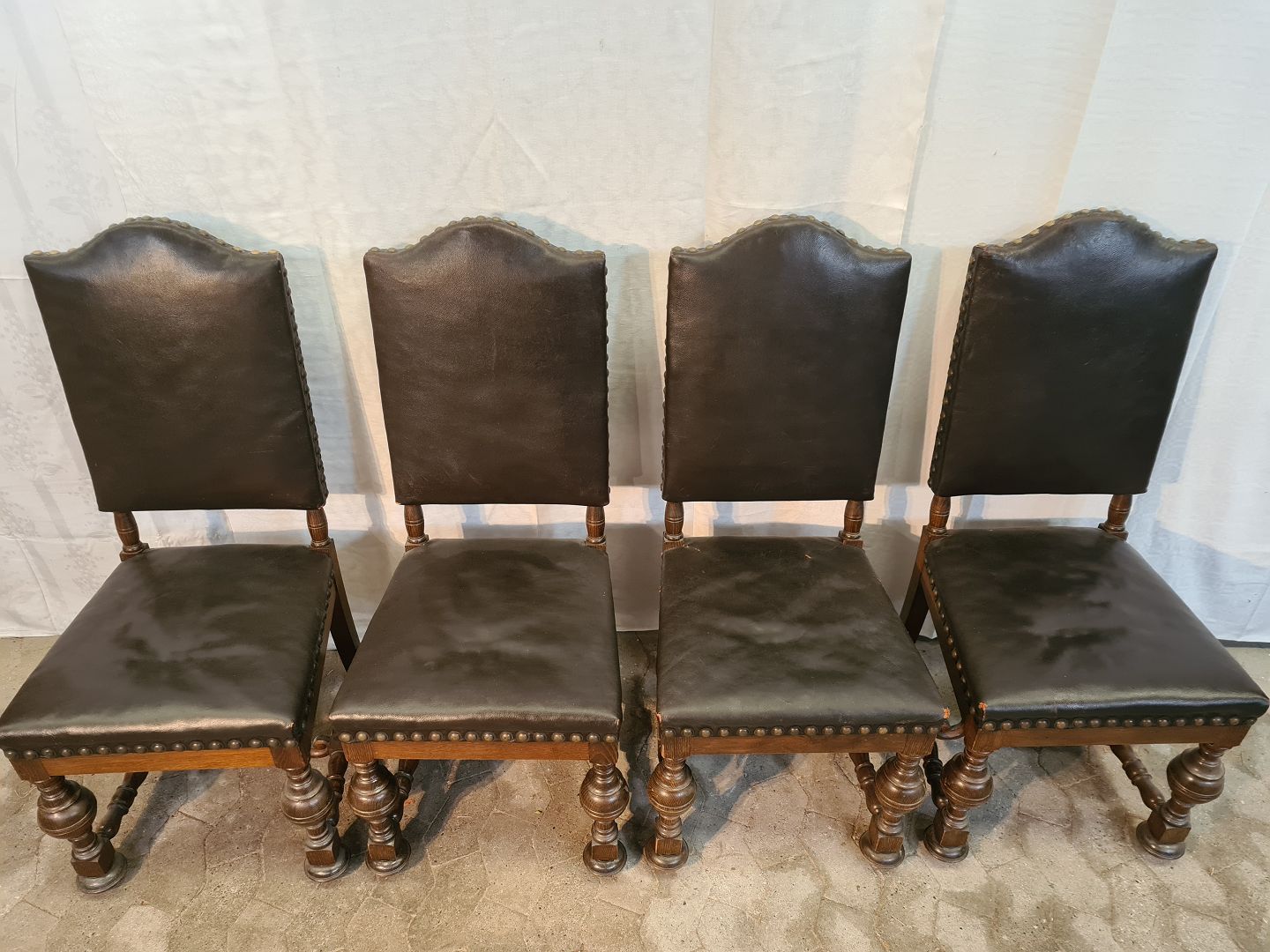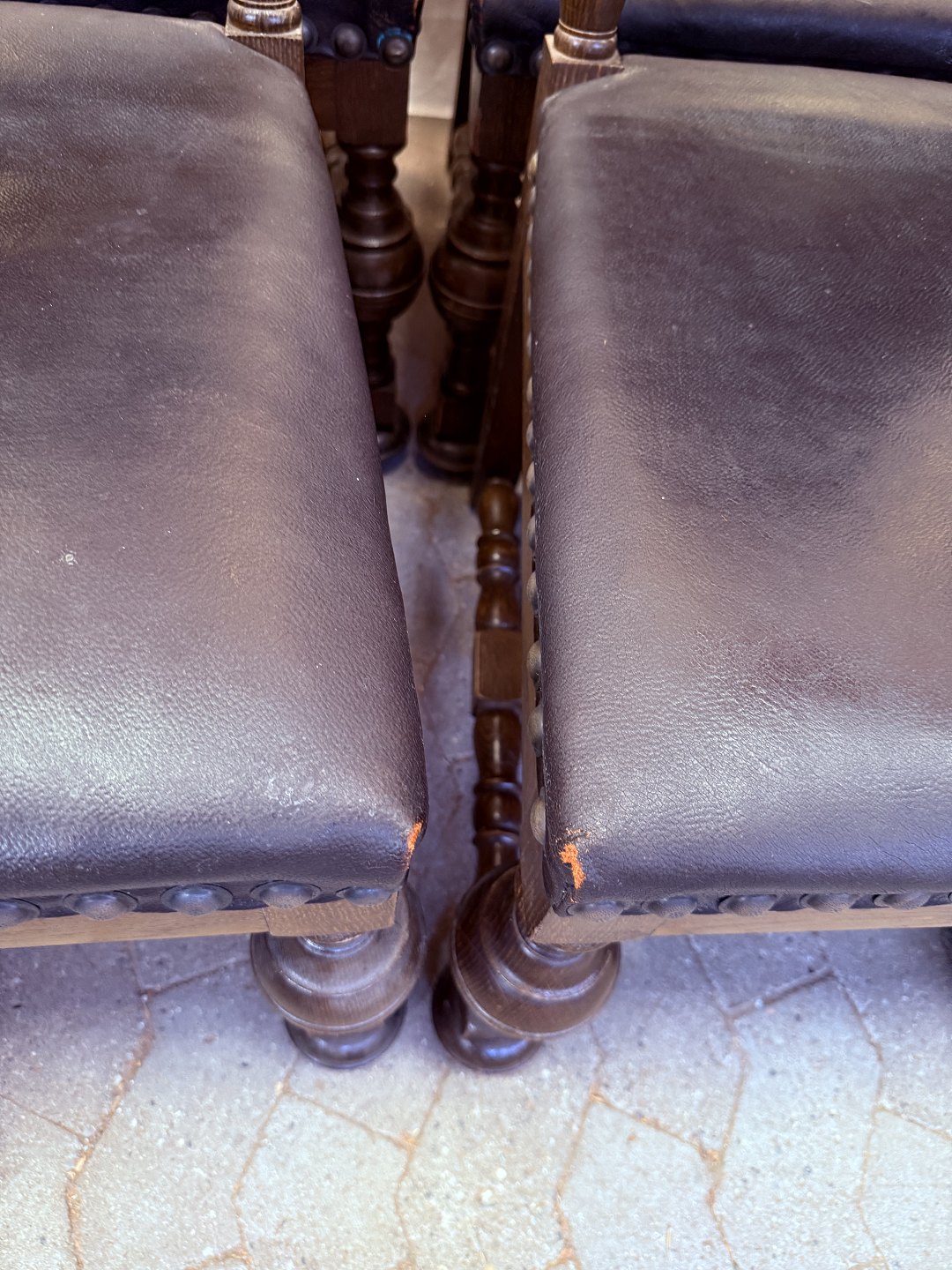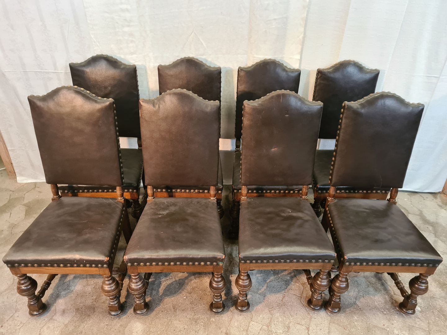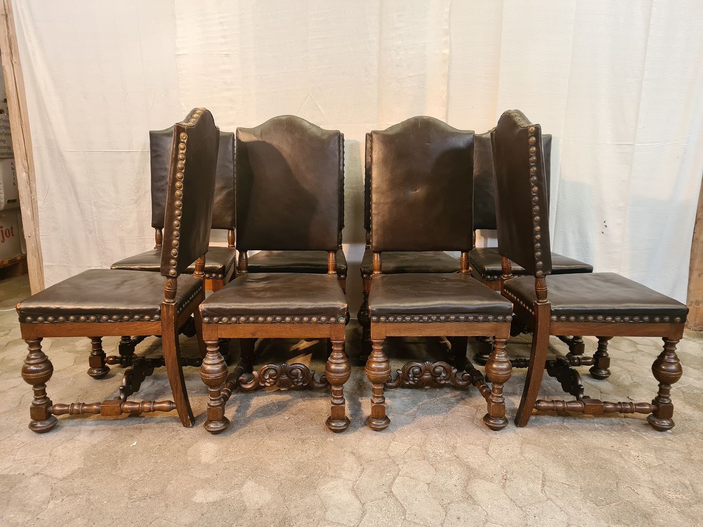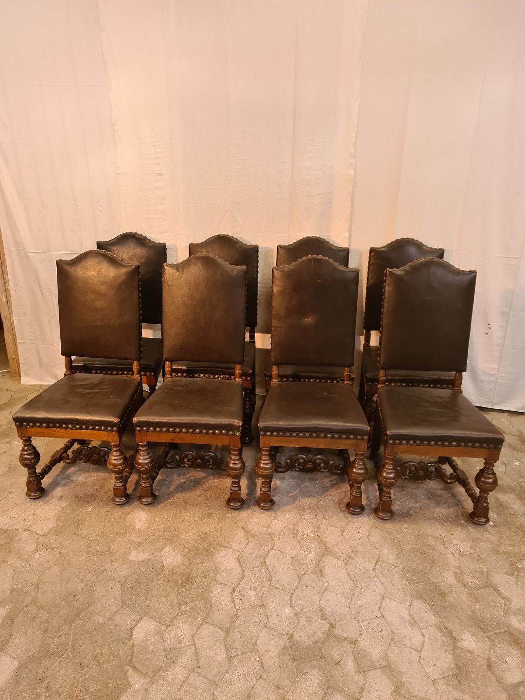 8 Stole i rænnessance stil i massivt egetræ med læderbetræk, fra 1930erne.