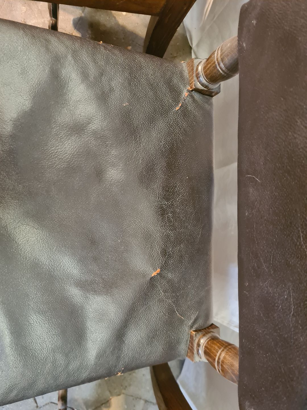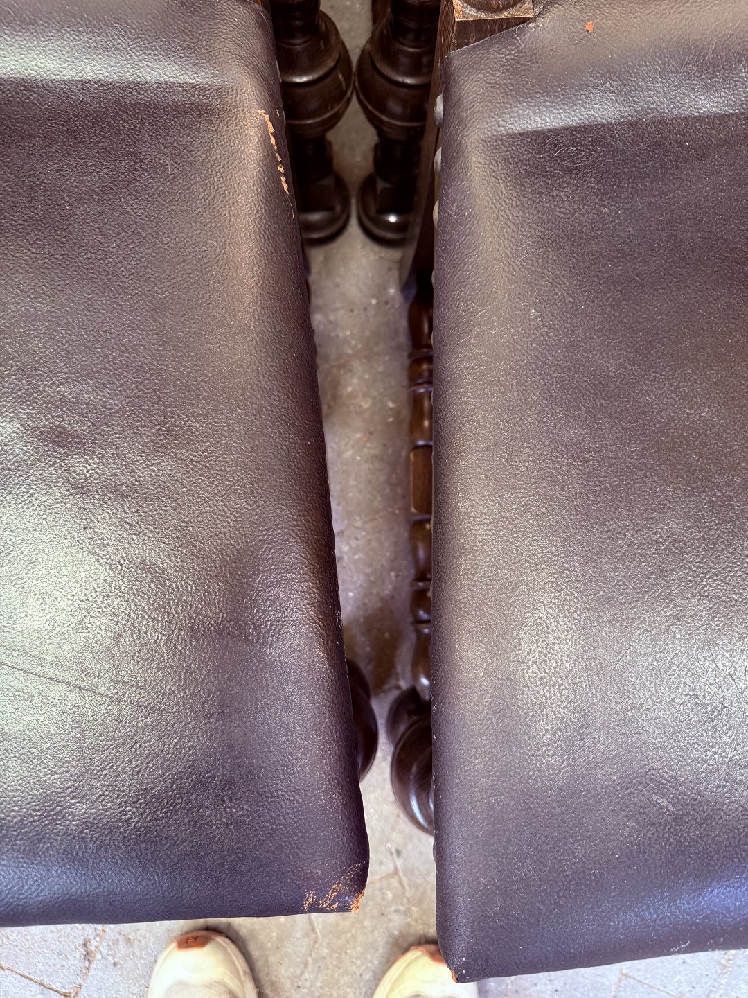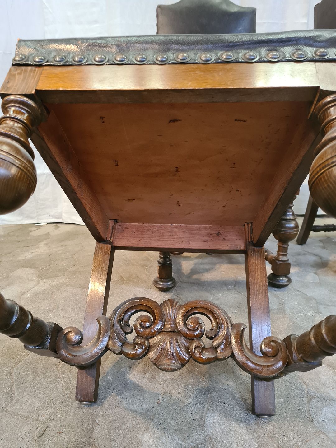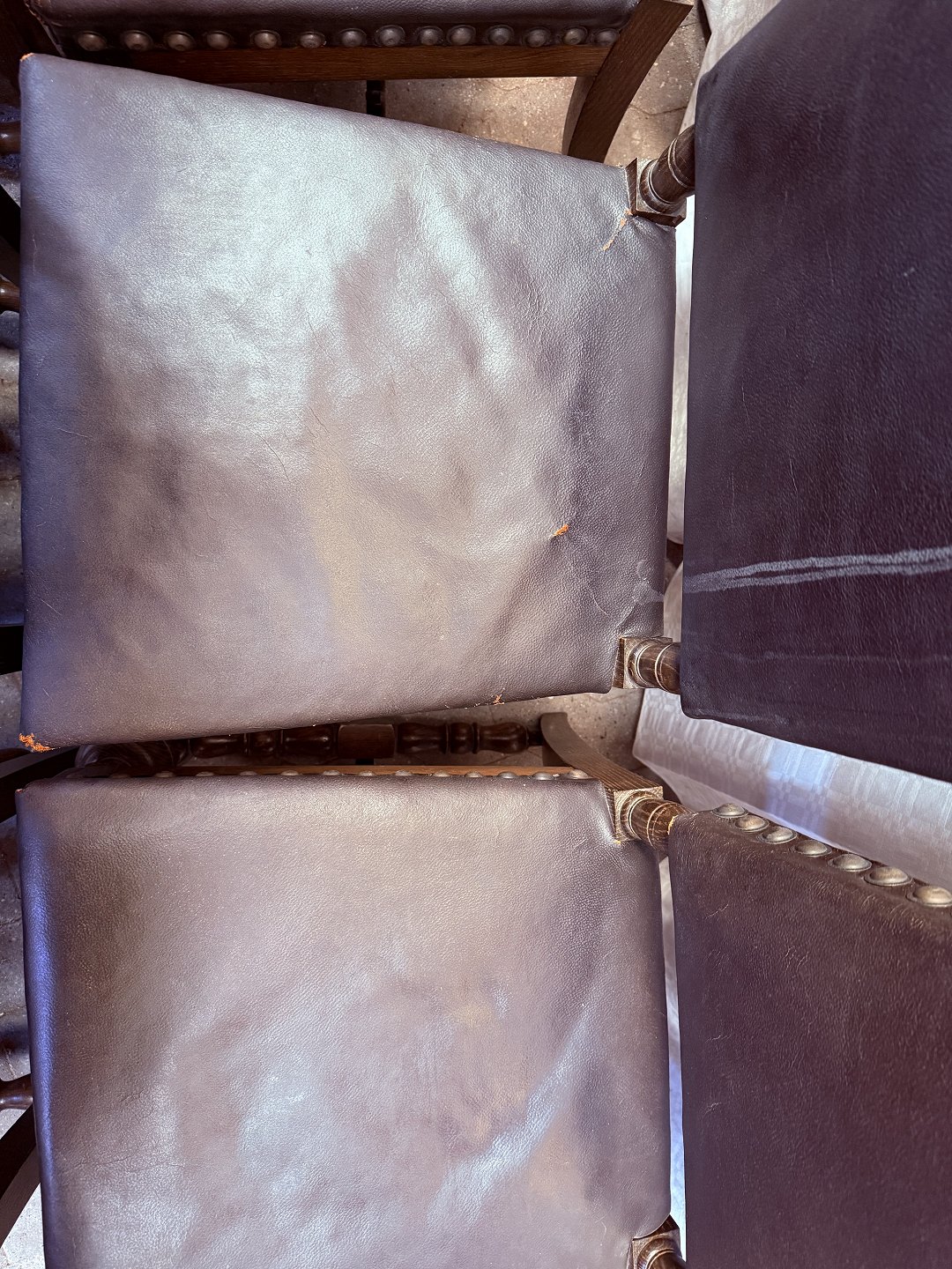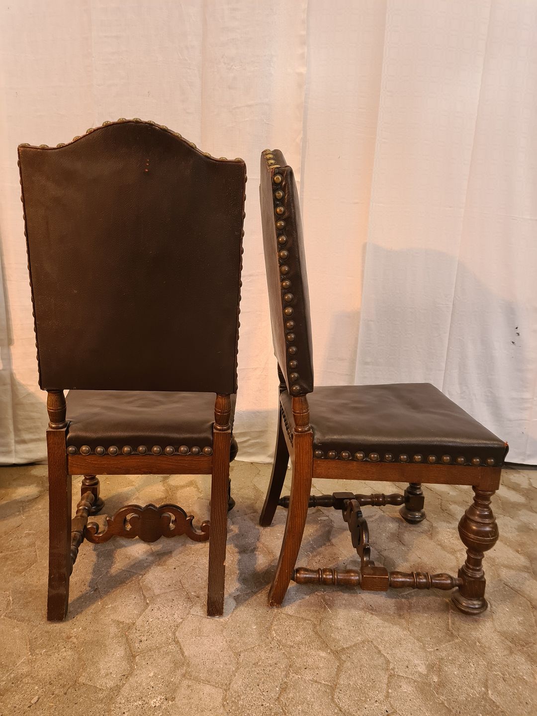 8 Stole i rænnessance stil i massivt egetræ med læderbetræk, fra 1930erne.