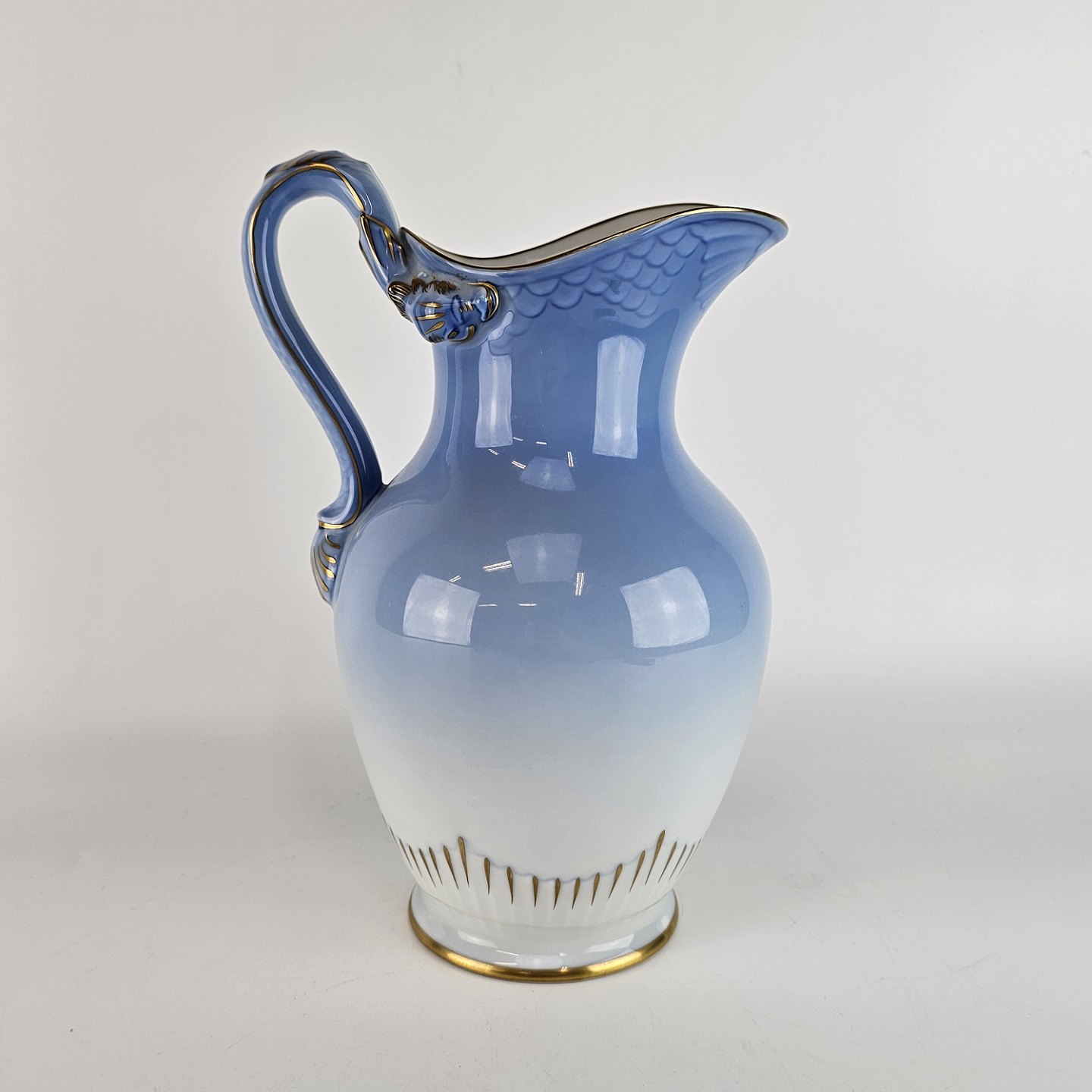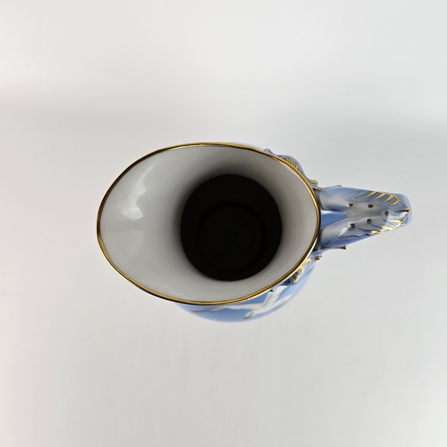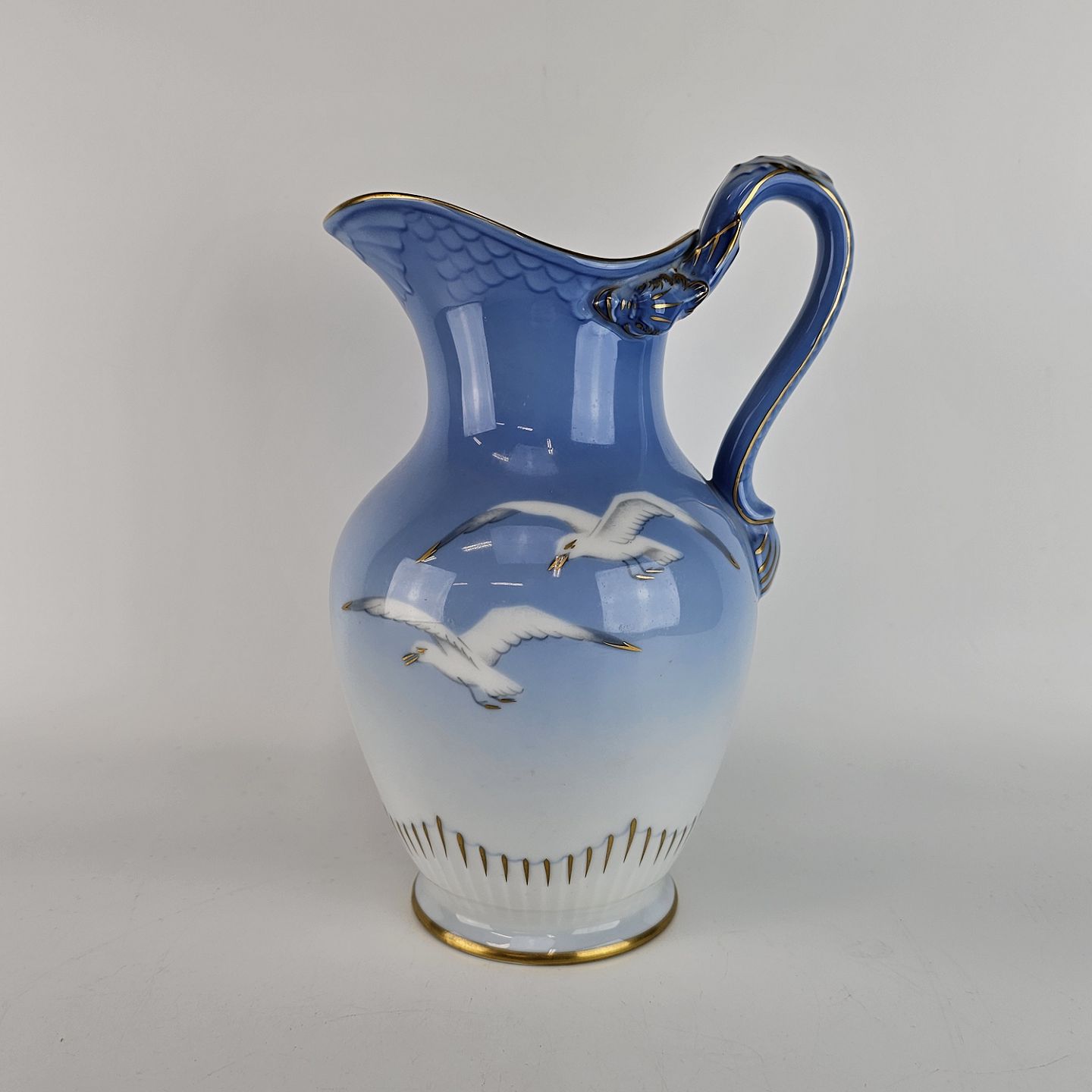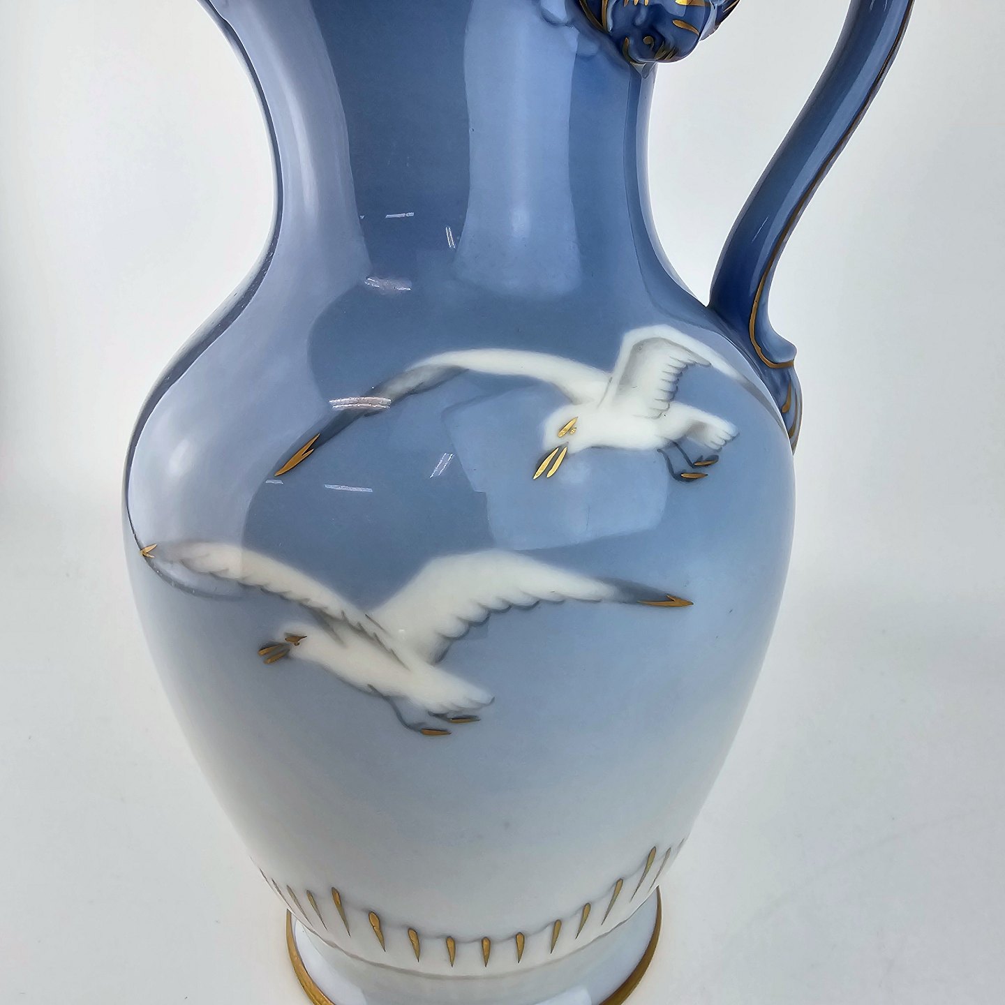 Krukke af porcelæn i blålige farver med motiv af måger og guldkant