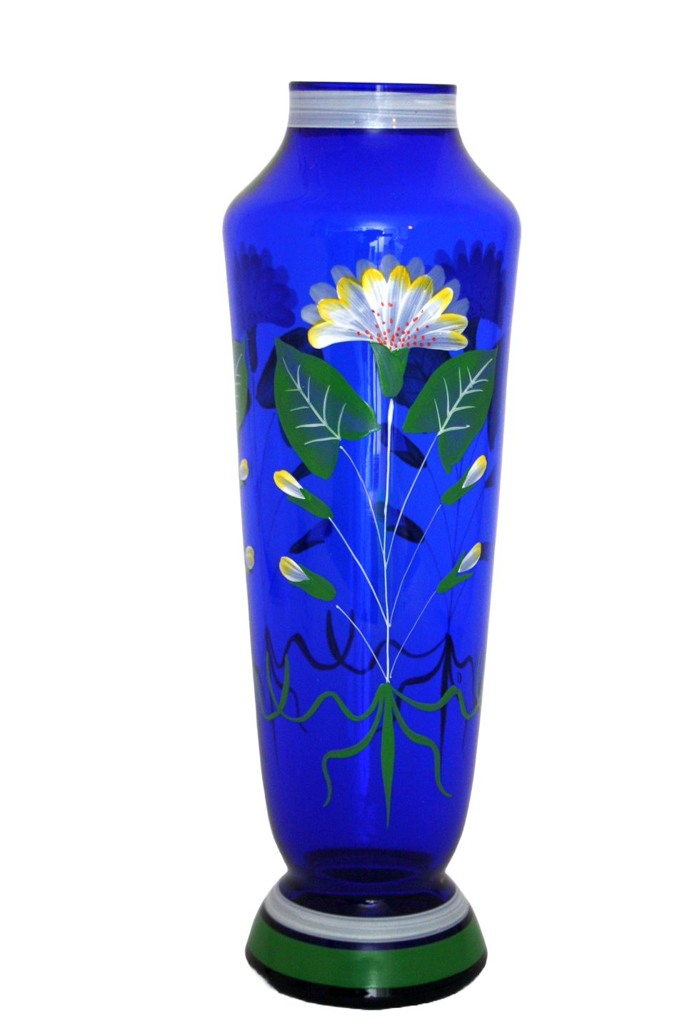 Blå slank vase med påmalede blomster i Art Deco stil. Højde 25,5 cm. Øverste diameter 4,5 cm. Flot stand. Pris: 350 kr.