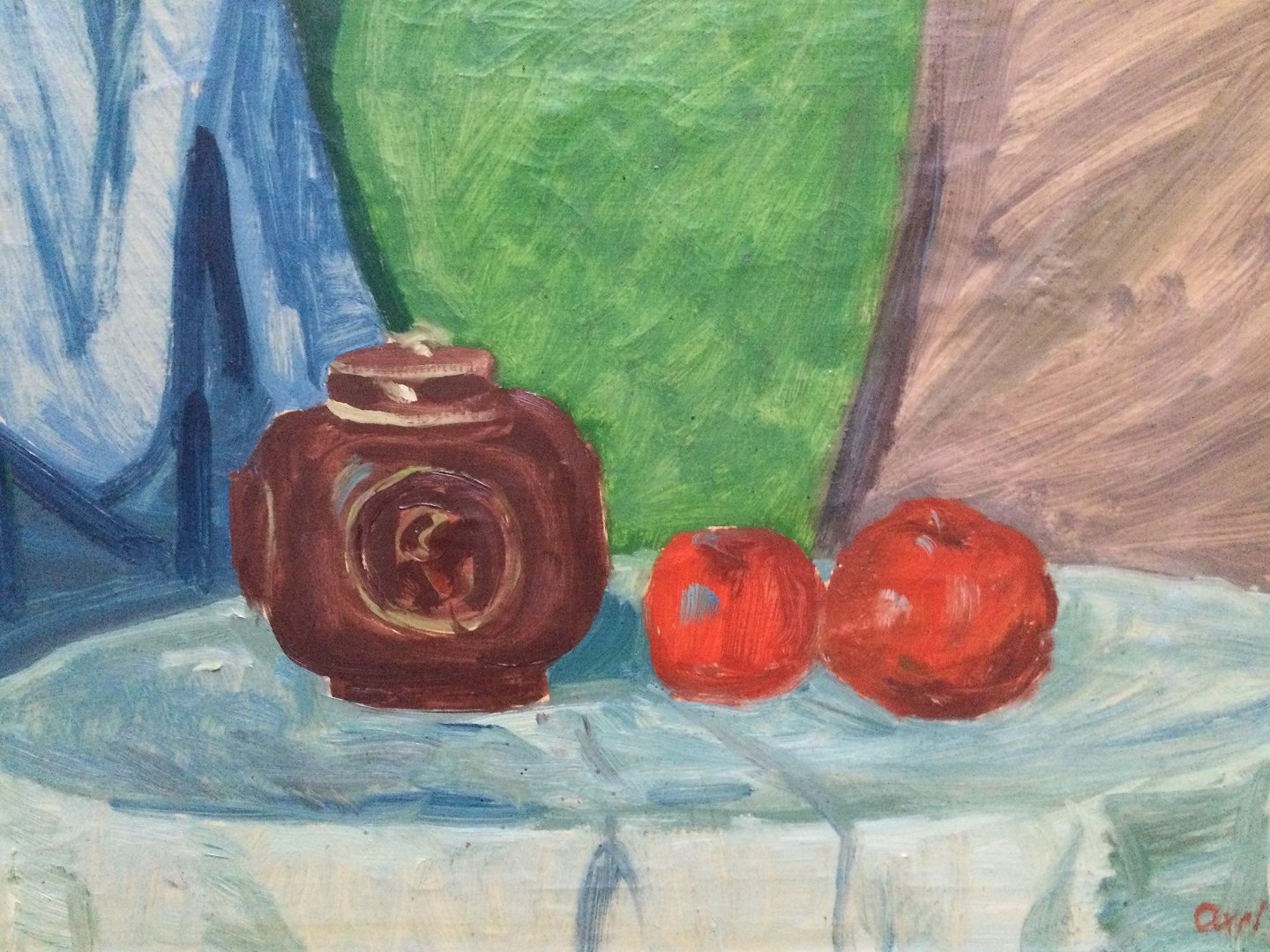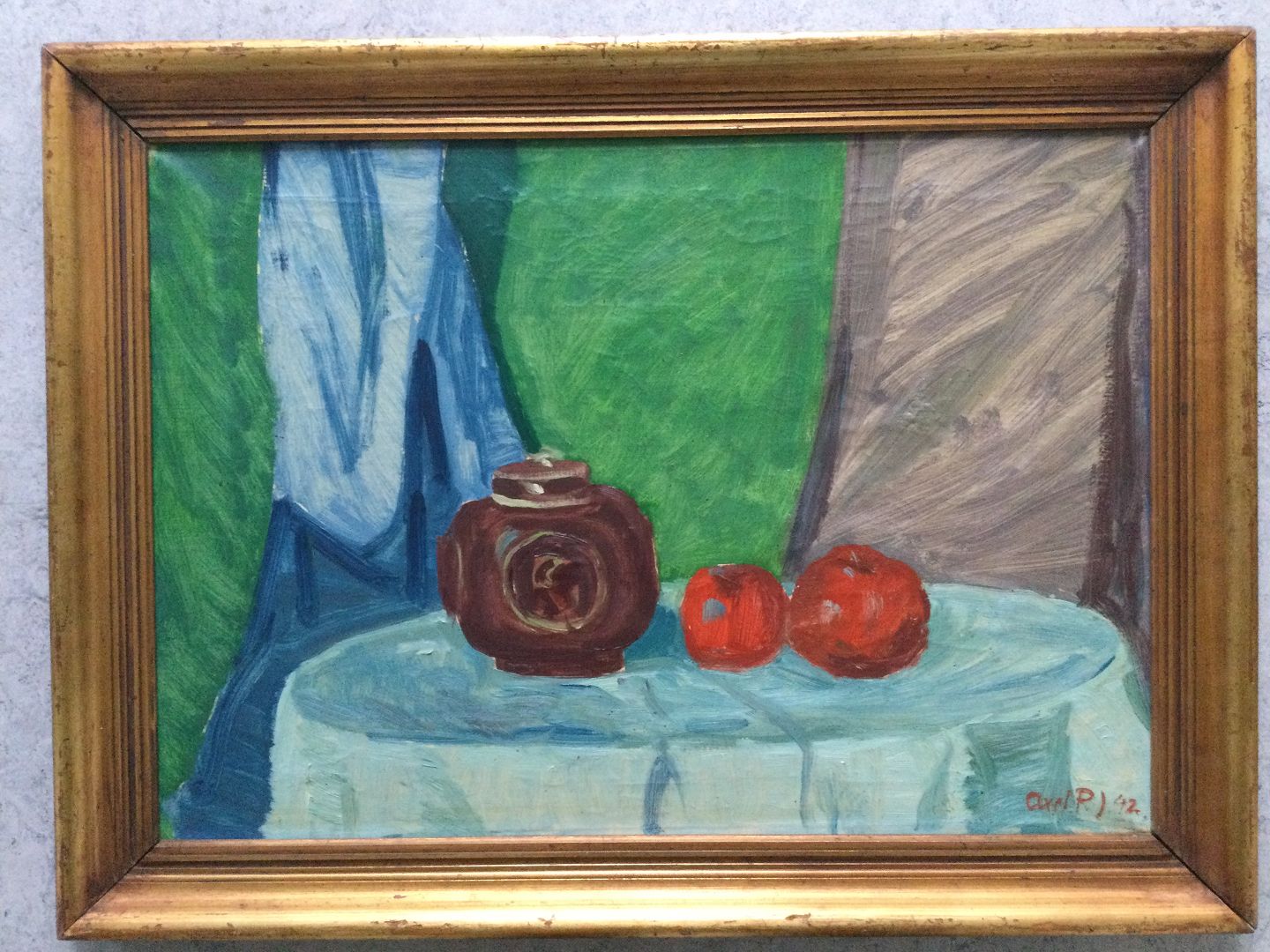 Opstilling på bord med Jais Nielsen lågbojan og æbler 1942