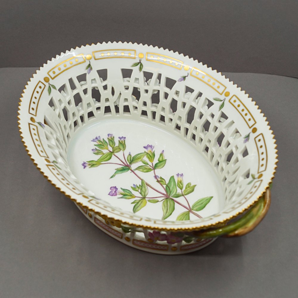 Royal Copenhagen, Flora Danica porcelæn; Oval frugtskål #3536 med gennembrudt kant.