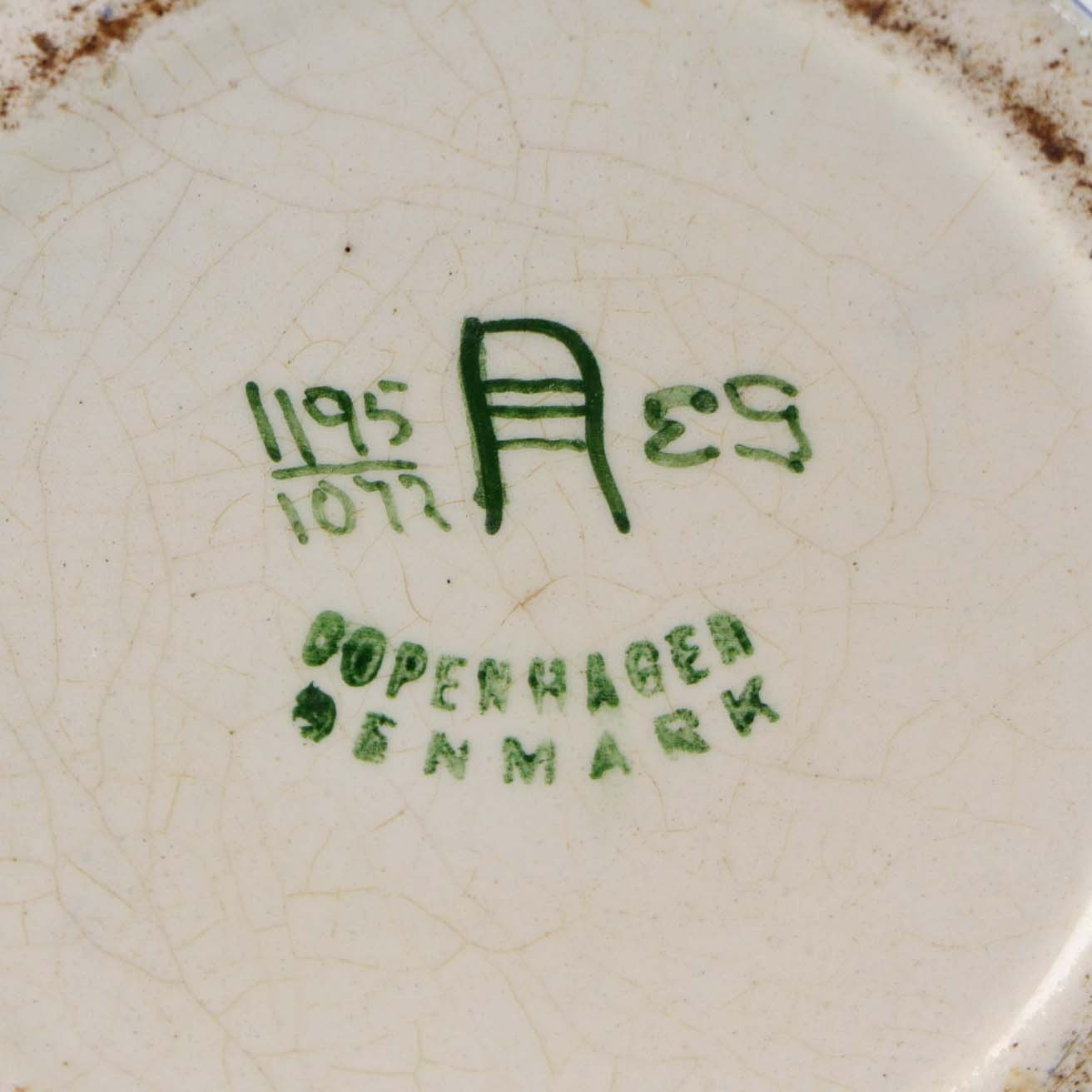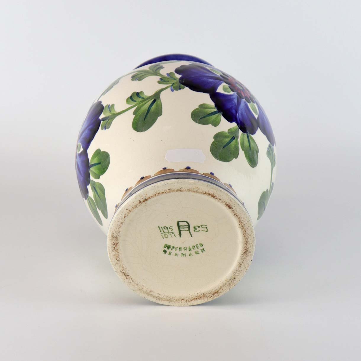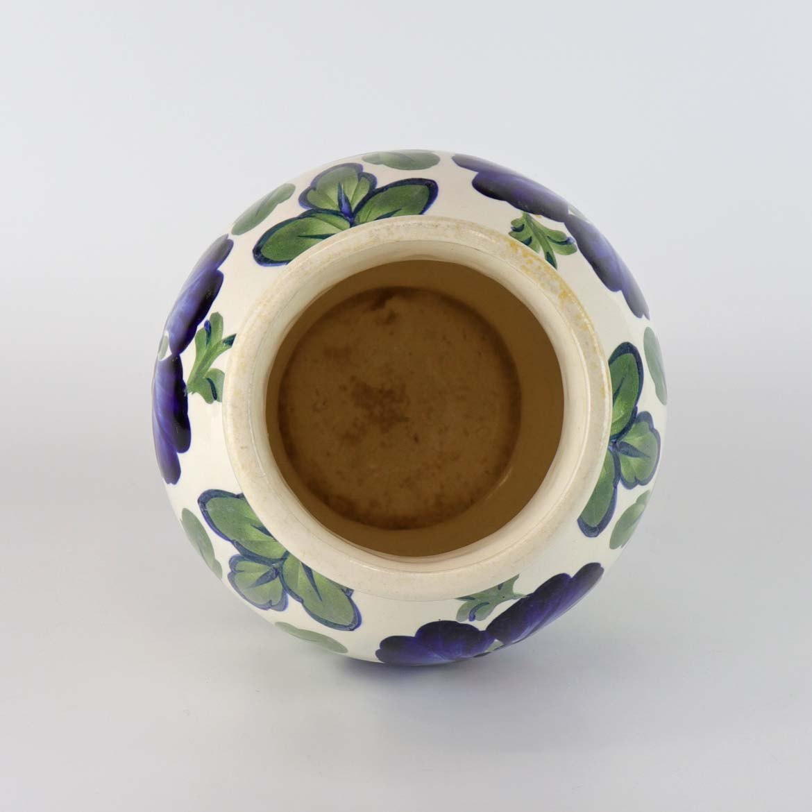 Vase i fajance med teksten Jul 1920 og motiv af en blå blomst på lys baggrund. Nr. 1195/1072