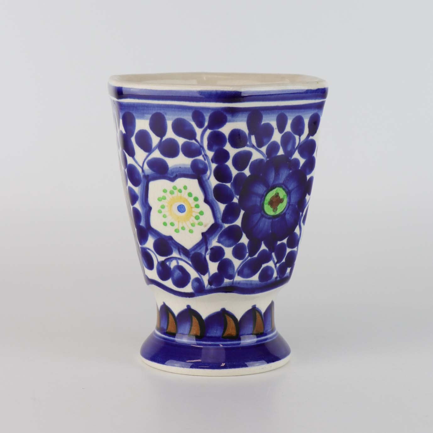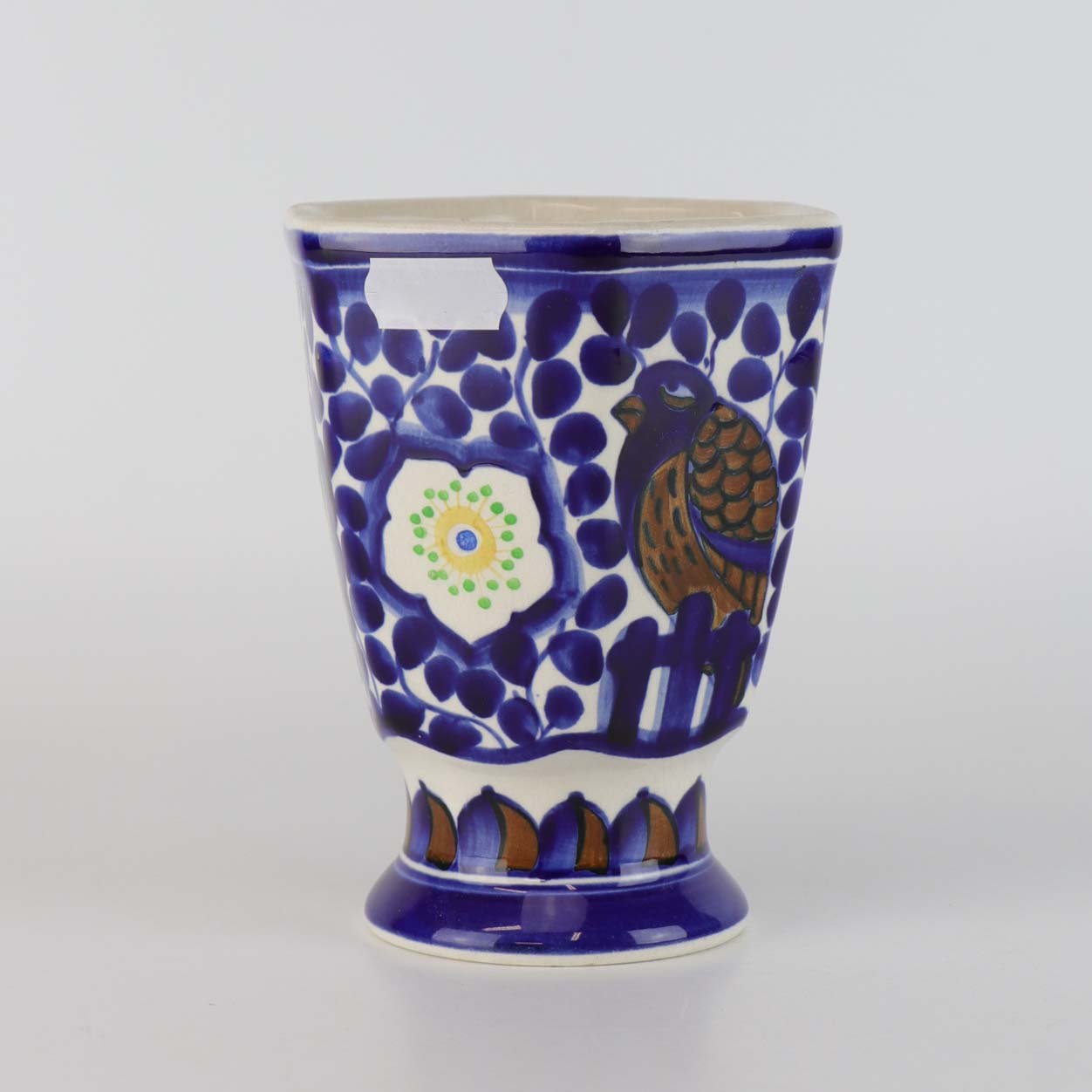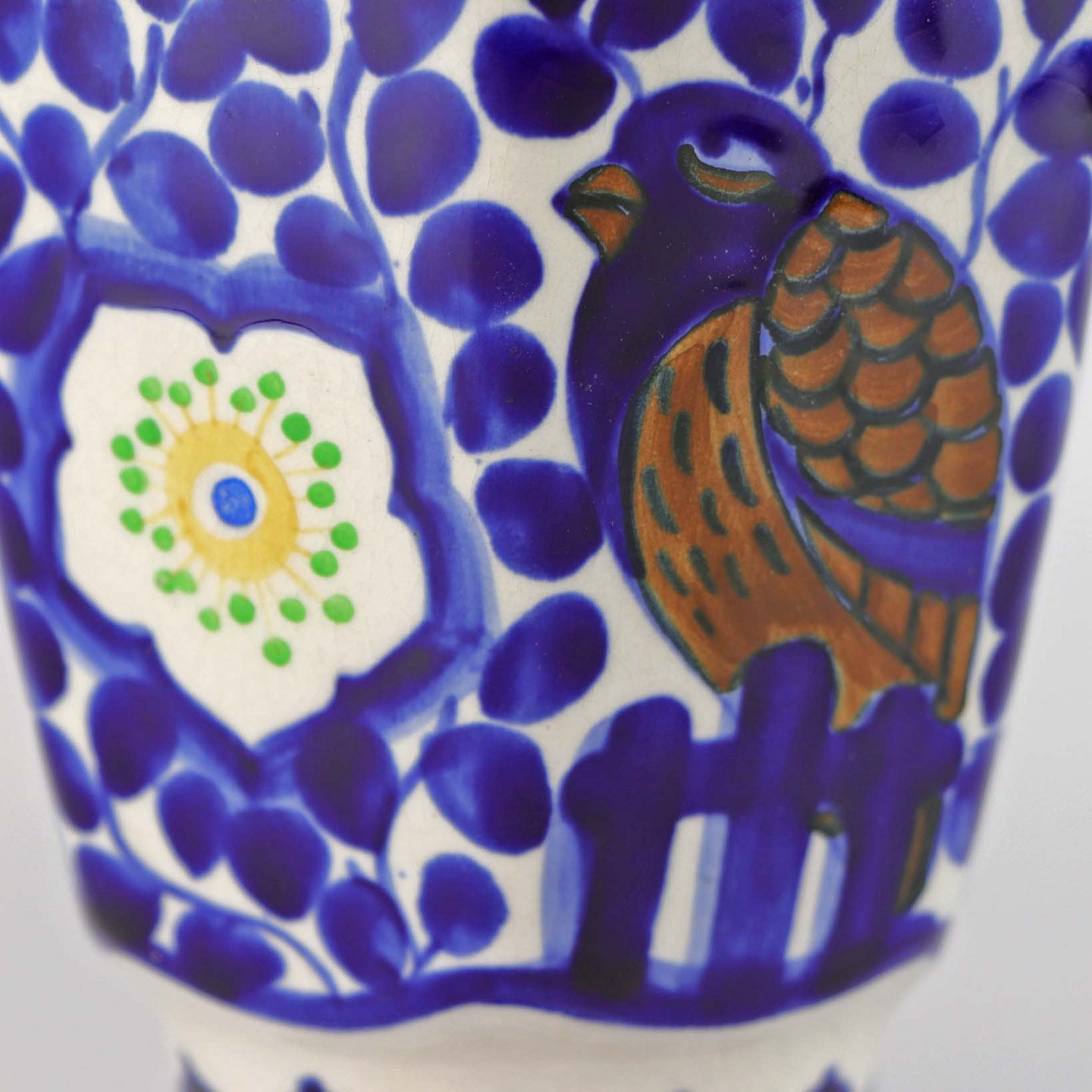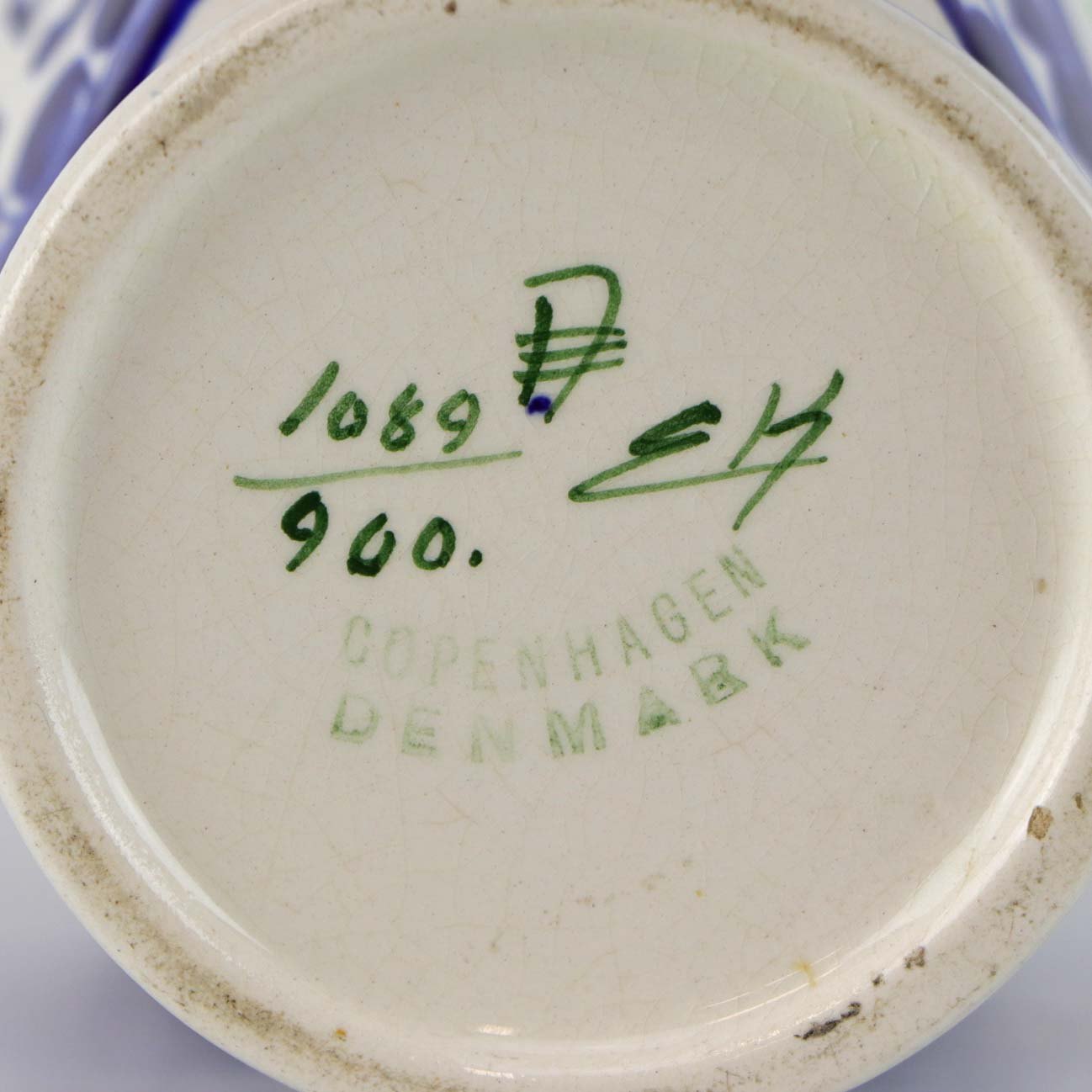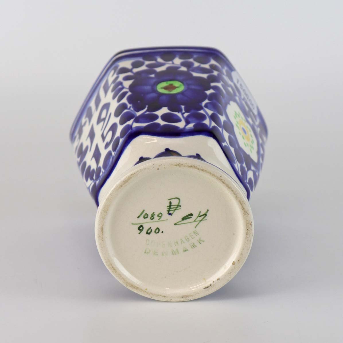 Text available in Danish: Sekskantet vase i fajance med teksten Jul 1915 og motiv af en fugl samt blomster blandt blå ranker på lys baggrund. Nr. 1089/900