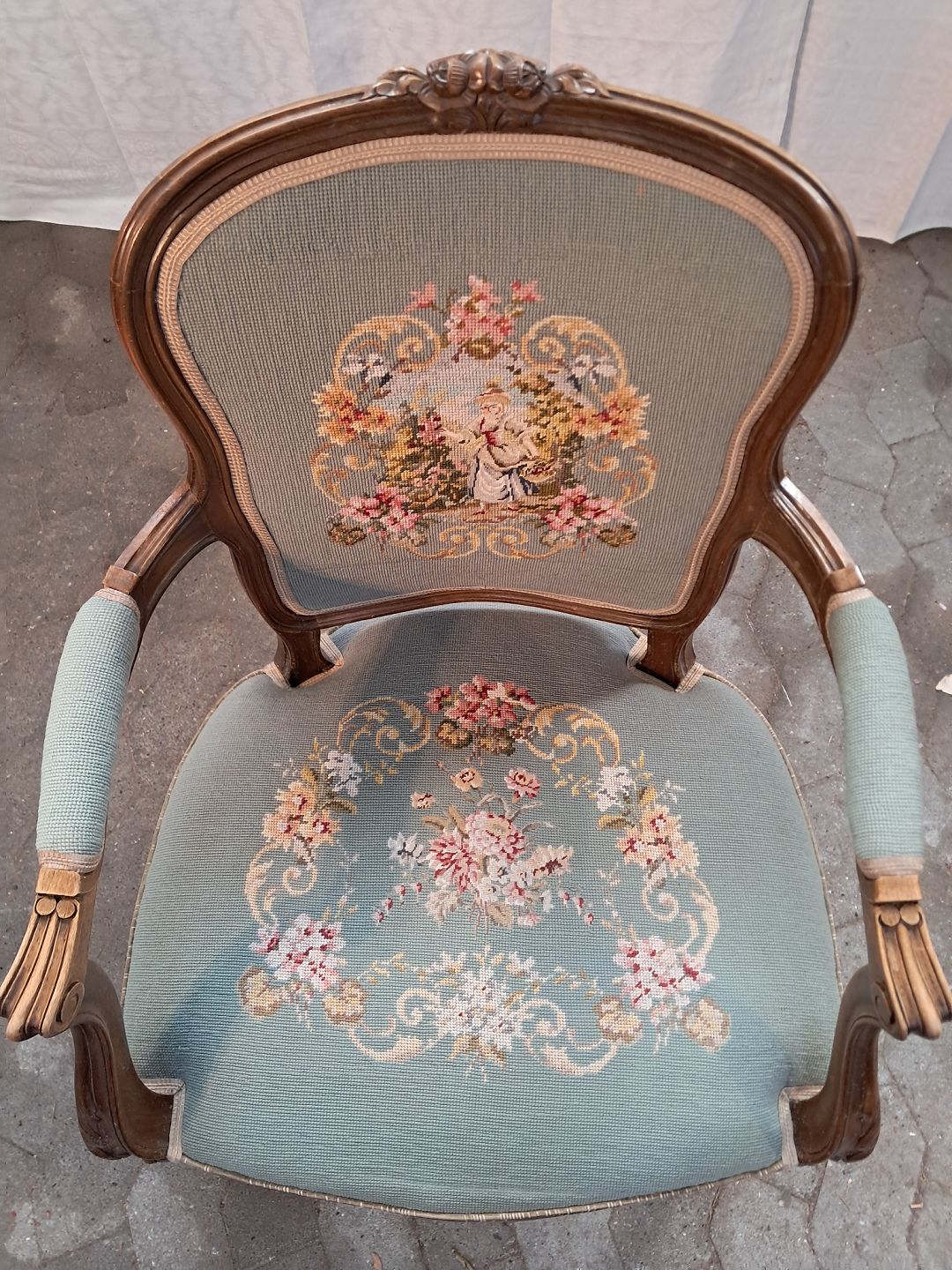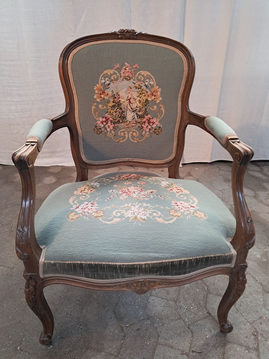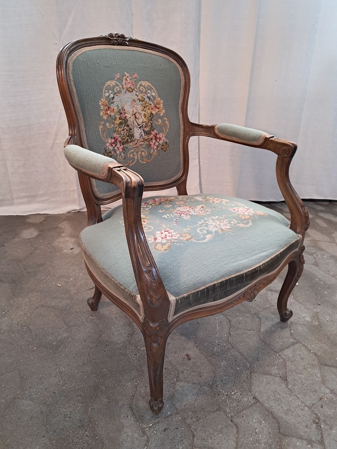Rokokostol i massivt bøgetræ med broderet sæde, fra 1950erne.