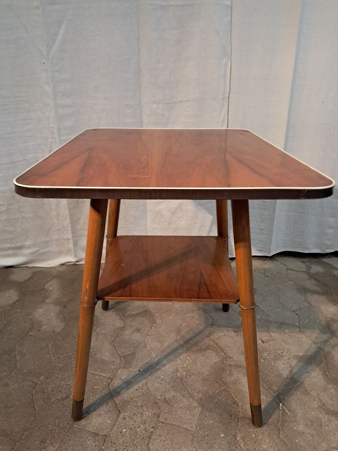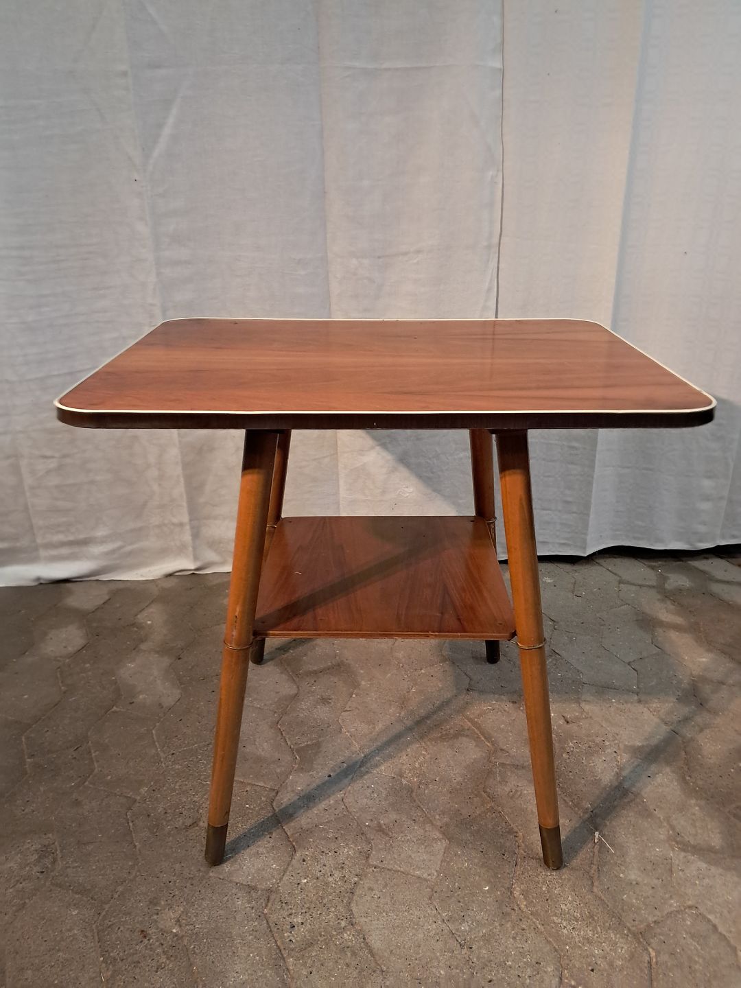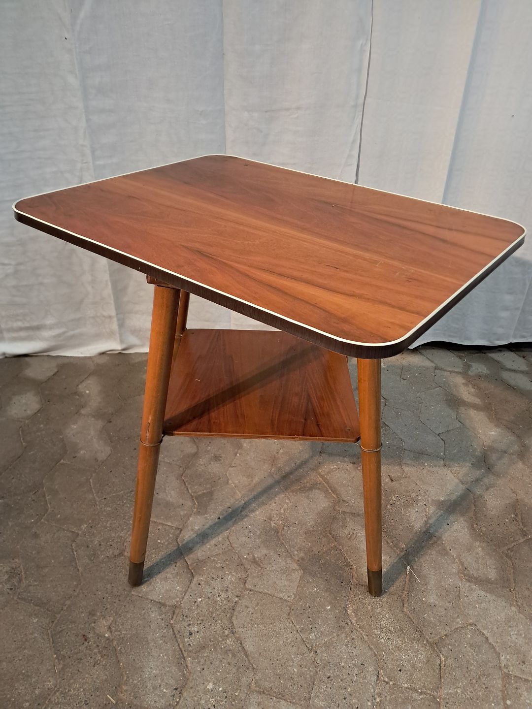 Bord i massivt bøgetræ med plade i fineret nødetræ og plastkant, fra 1950erne.
