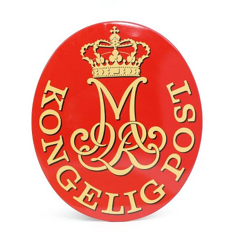 Postskilt. Rødt ovalt emaljeskilt “KONGELIG POST”. Det har aldrig været ophængt. (65×77 cm.)