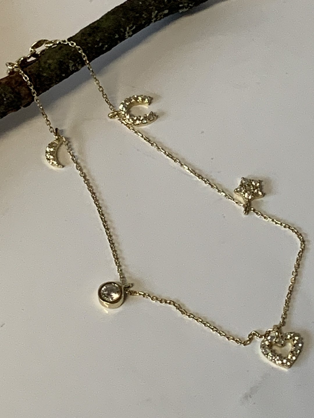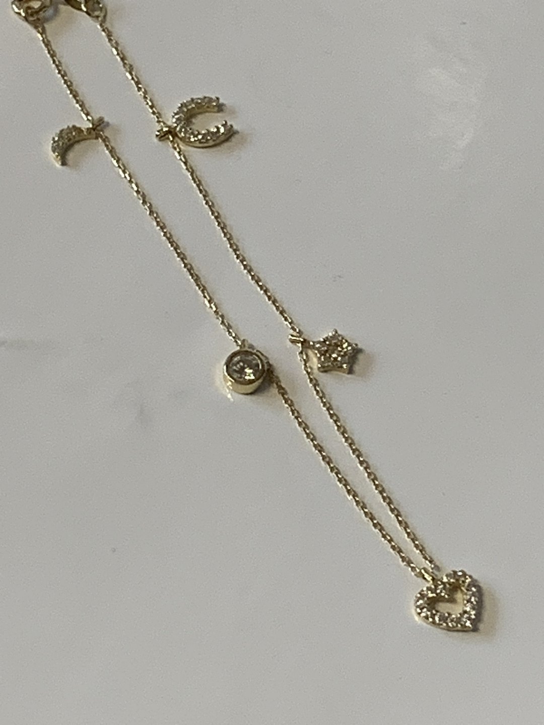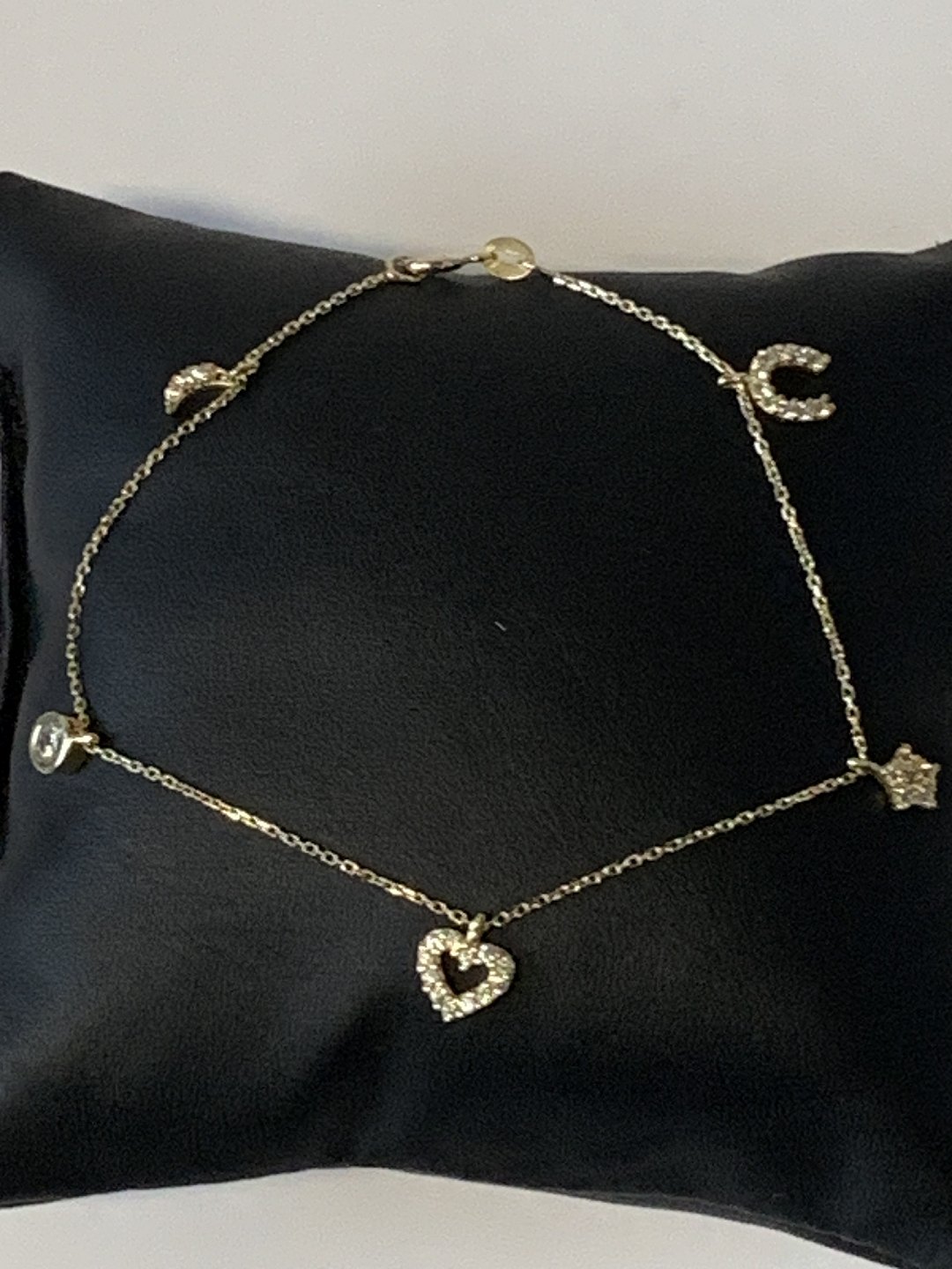Sweet and feminine gold bracelet in 14 carat gold, with beautiful pendants, e.g. heart and horseshoe. The bracelet is thin and lies softly on the wrist. The small pendants give the bracelet life and dynamism. Ideal gift idea for the young girl.