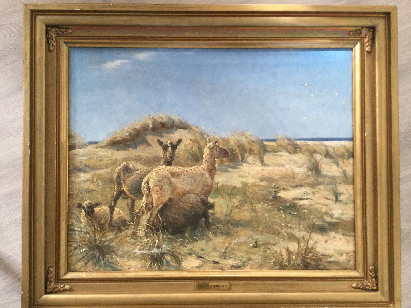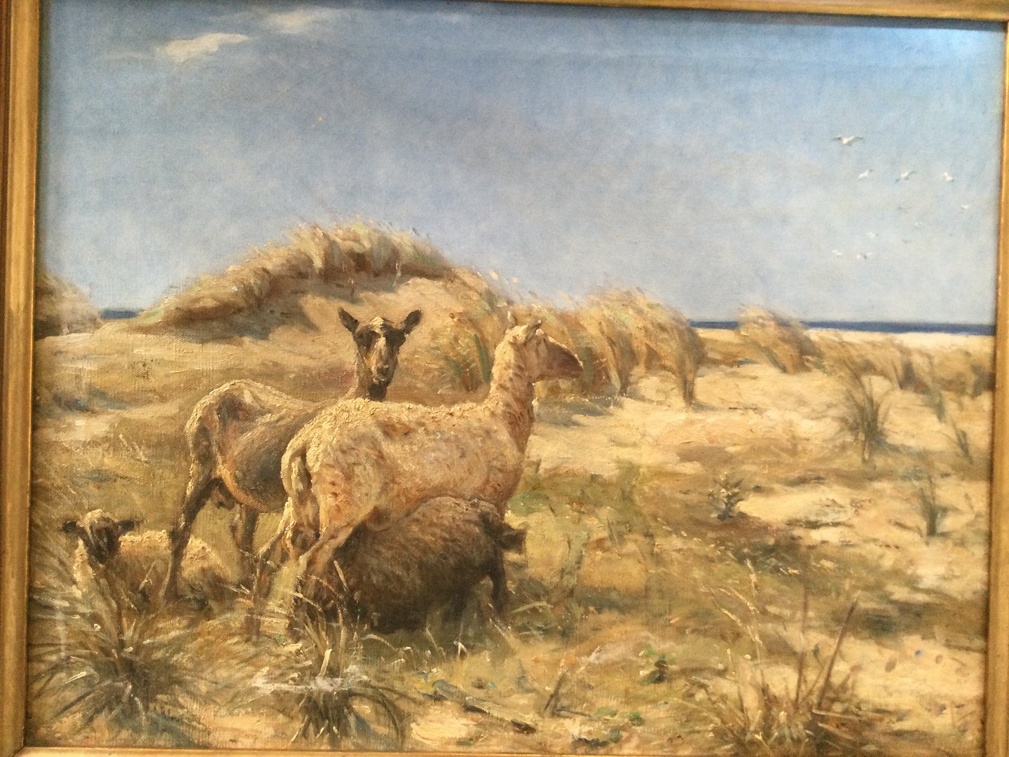 Text available in Danish: Maleri af Valdemar Irminger - Klitparti med græssende får.