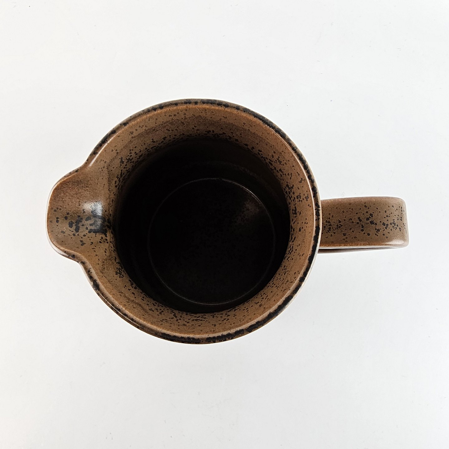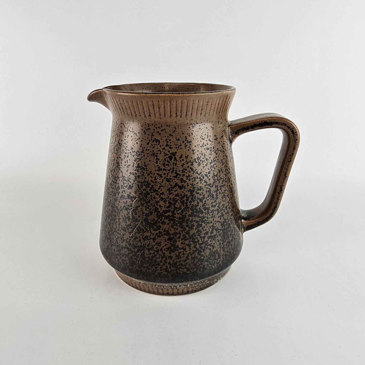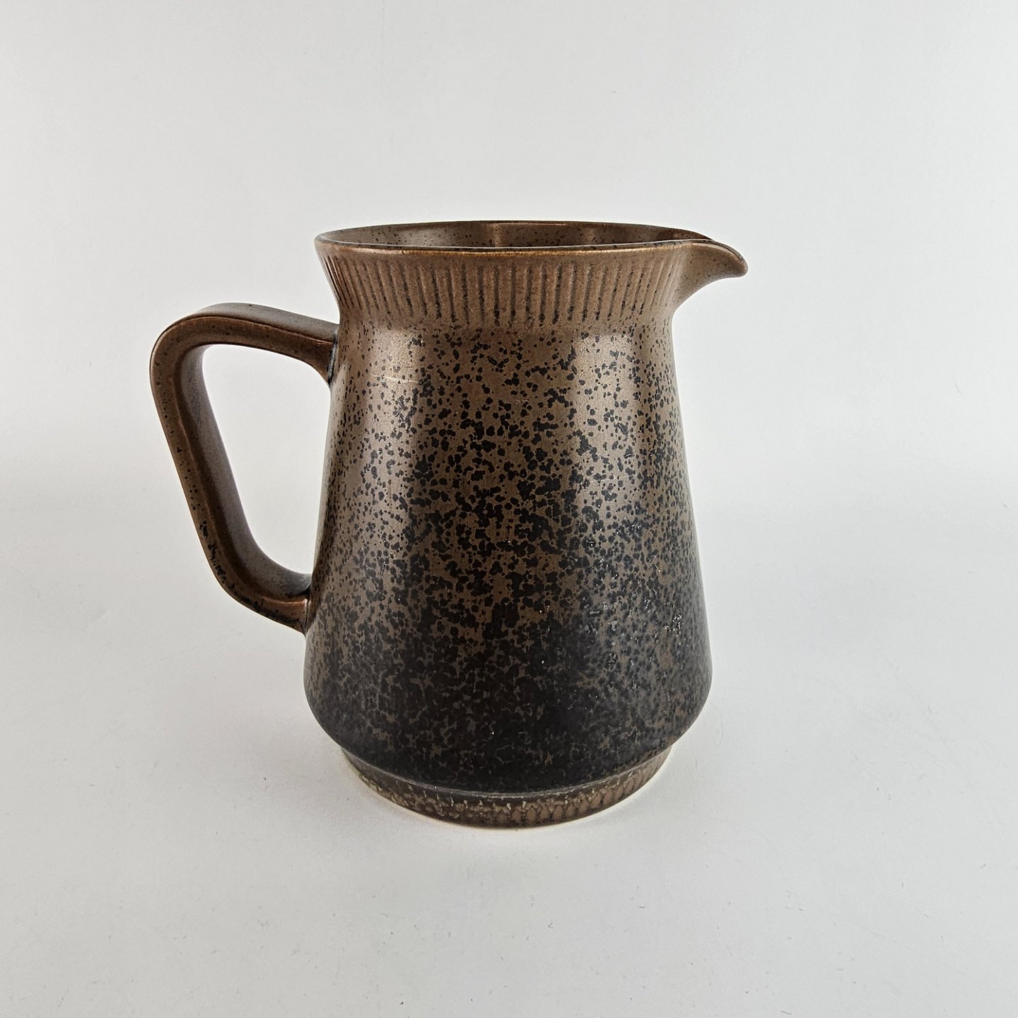 Text available in Danish: Kande af stentøj og dekoreret med en brun nuance glasering.