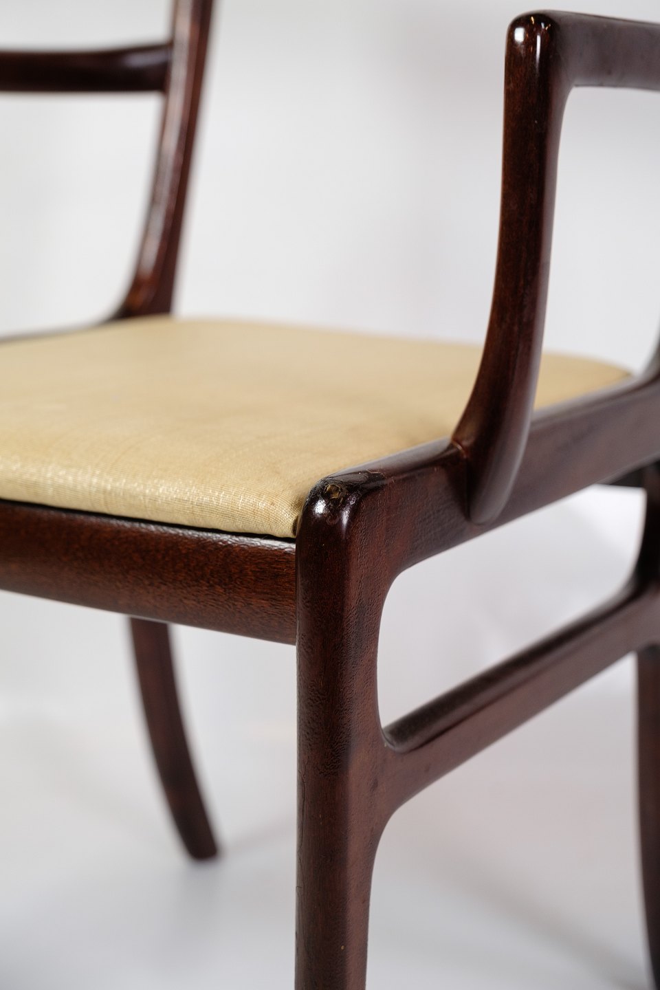 Set of 2 armchairs, model Rungstedlund, designed by Ole Wanscher and produced by P. Jeppesen in the 1960s. The chairs are made of mahogany and upholstered with light fabric, which gives them a classic and elegant look. The Rungstedlund chairs are a good example of Wanscher's focus on craftsmanship, where both aesthetics and comfort are carefully considered.