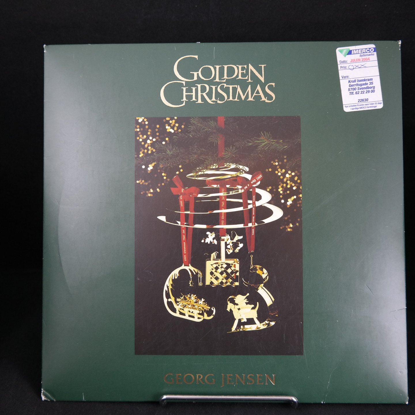 Julepynt i messing forgyldt med 24-karat guld fra Georg Jensen. Spiral ophæng til Juleuroer med rødt bånd i æske.