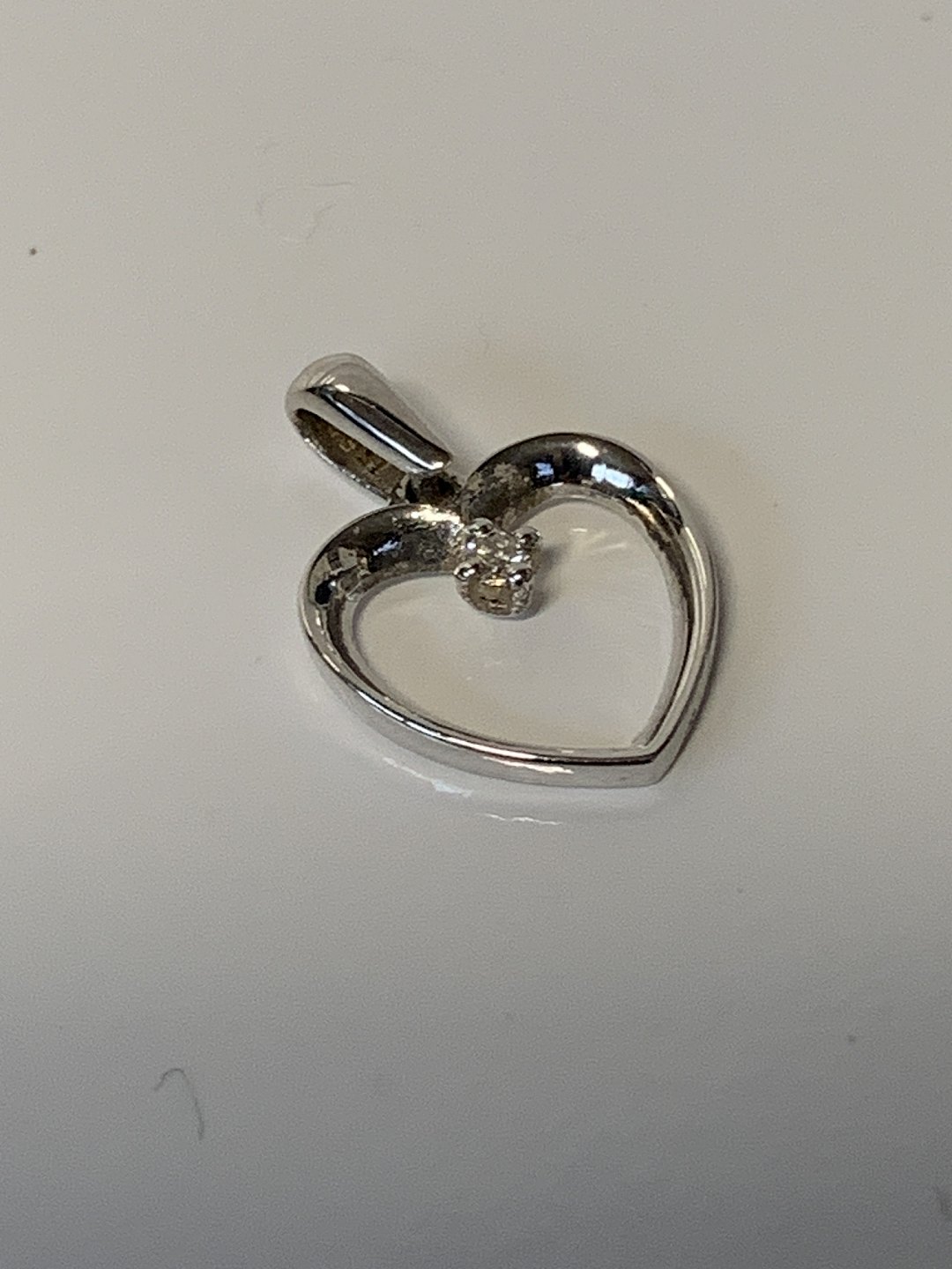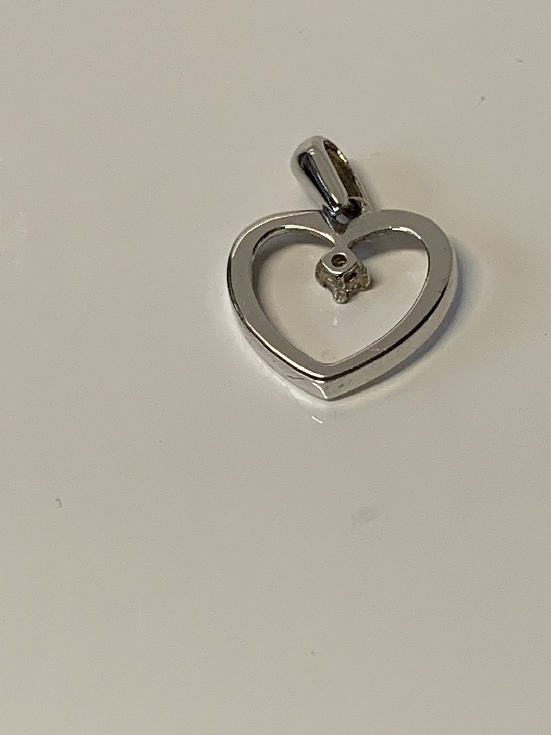 Nice and discreet pendant, shaped like a heart with a diamond in 14 carat white gold. Suitable for a necklace or as a pendant in a bracelet. Beautiful minimalistic and classic piece of jewelry that has been used for many years.