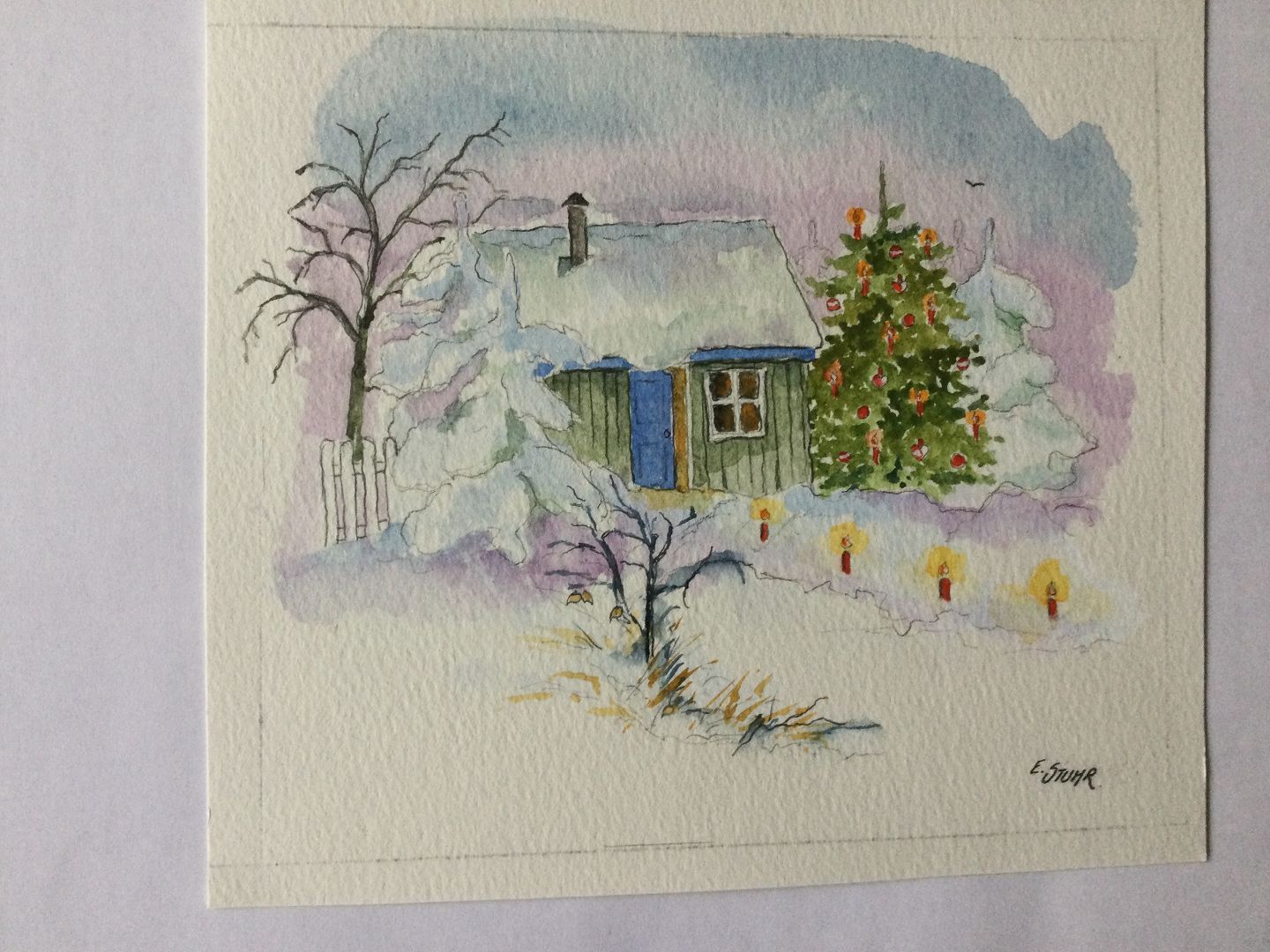 Akvarel af Erik Stuhr - Snelandskab med pyntet juletræ.