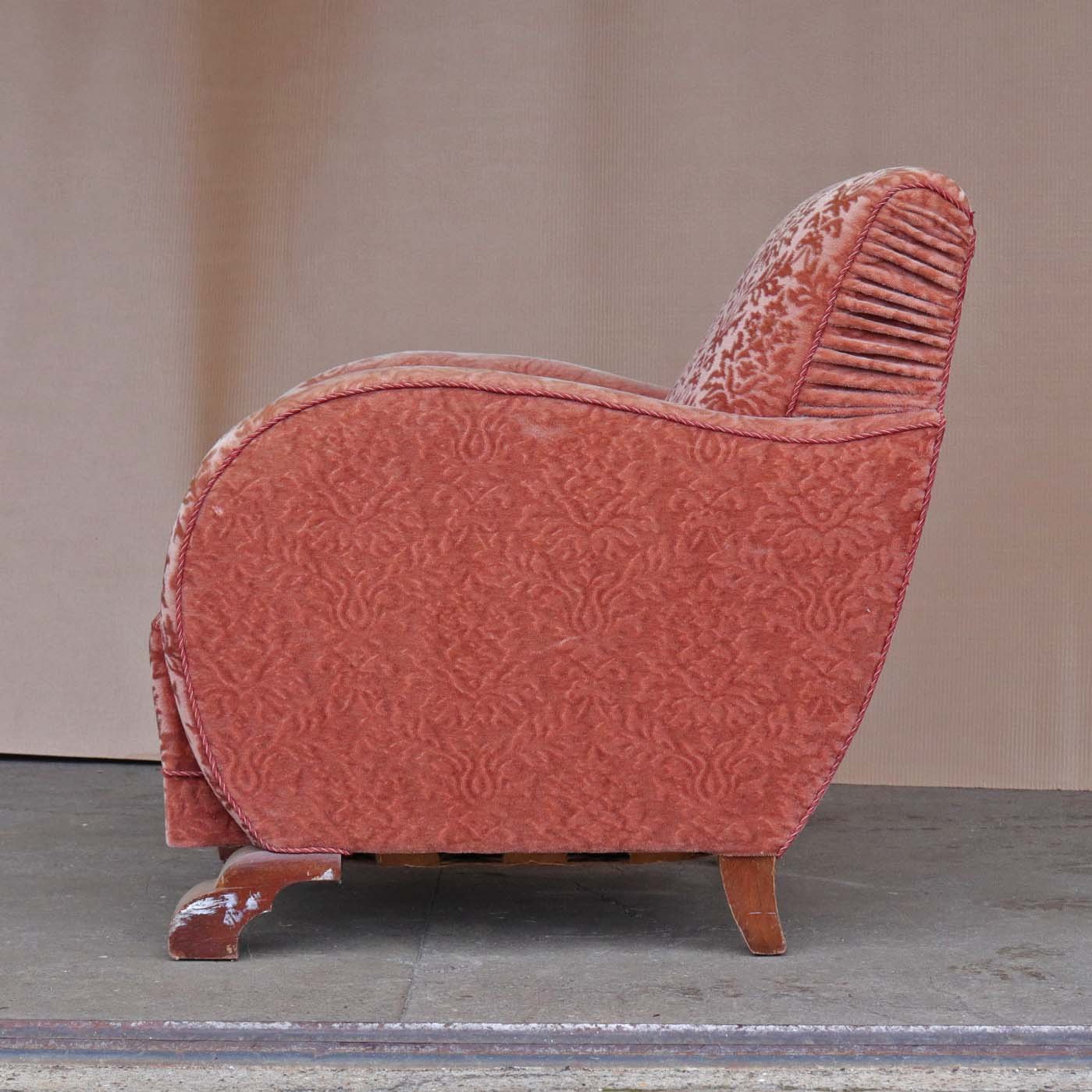 Ældre lænestol med stel i mørk lakeret træ. Stolen er betrukket med rosafarvet struktureret stof og har sæde med springfjeder