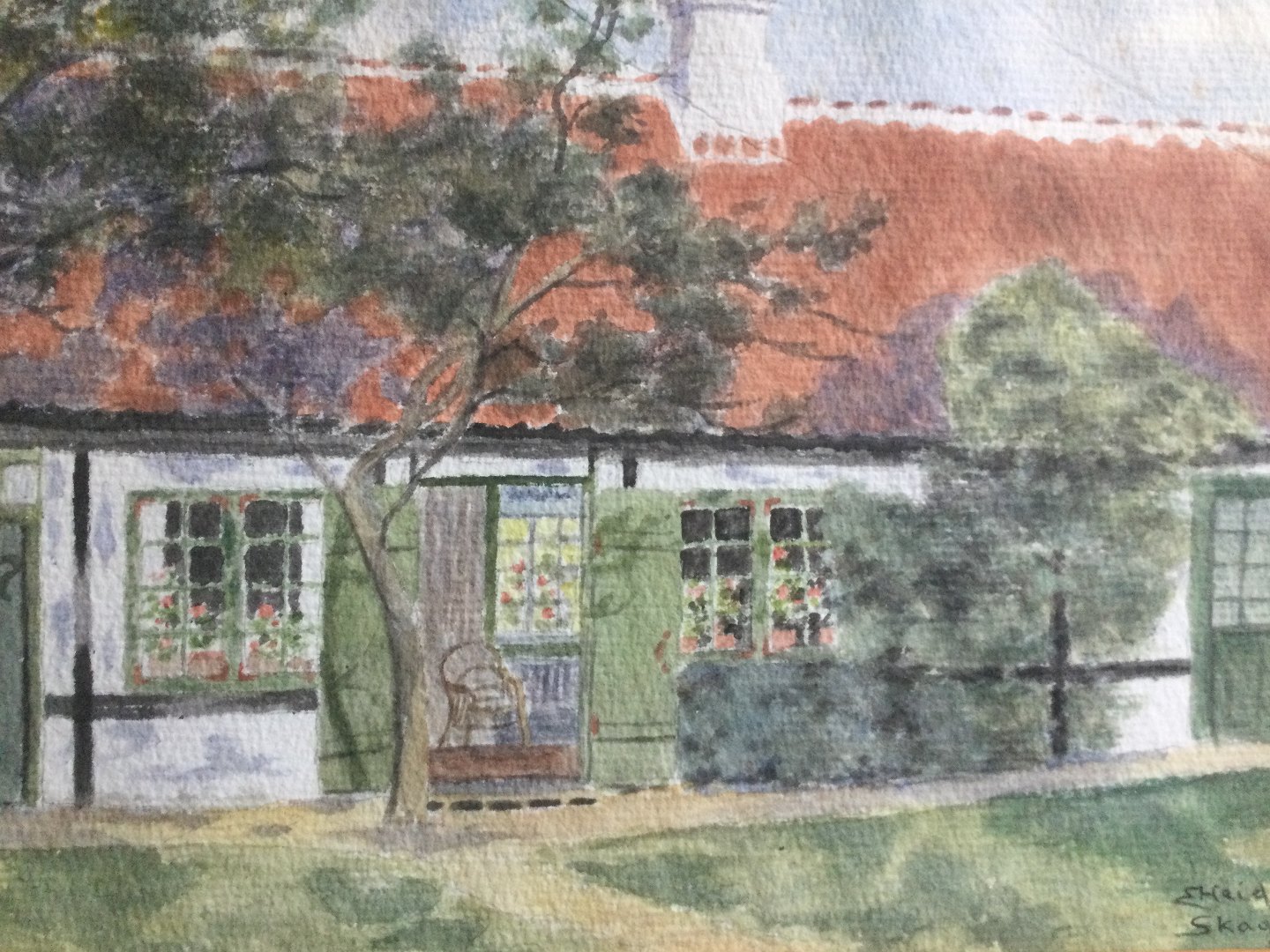 Text available in Danish: Akvarel af Ella Heide - Parti fra Holger Drachmann's Hus - Villa Pax, Skagen.