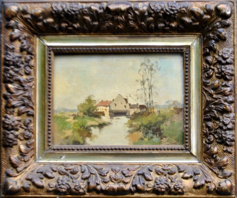 Galien - Laloue, Eugene (1854 - 1941) France: Mill. Oil on panel. Signed: L. Dupuy. H: 15.3 cm. W: 22 cm. Beautiful gilded ornamented frame with flowers.