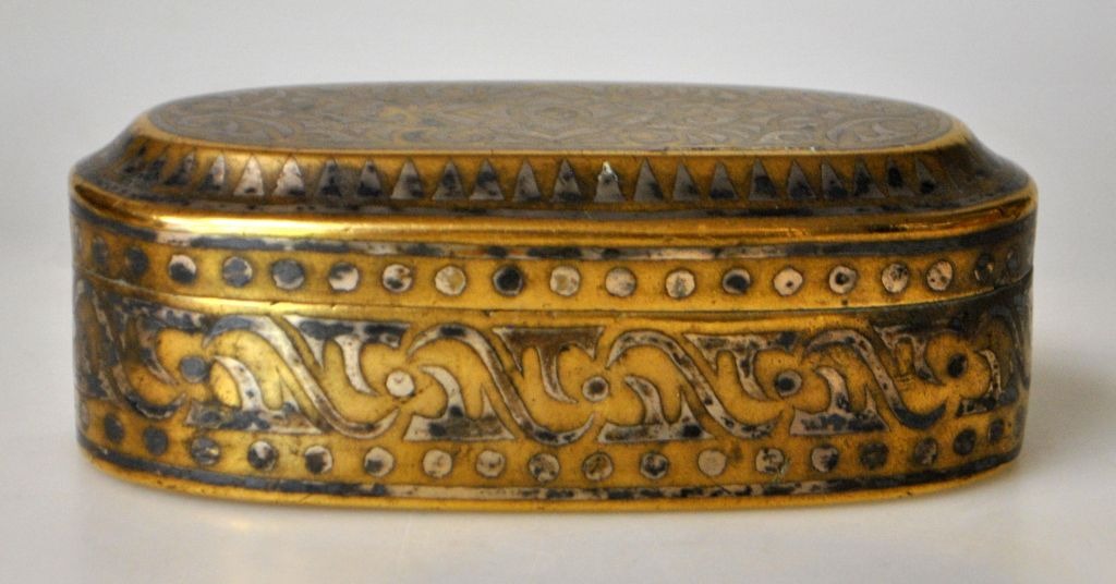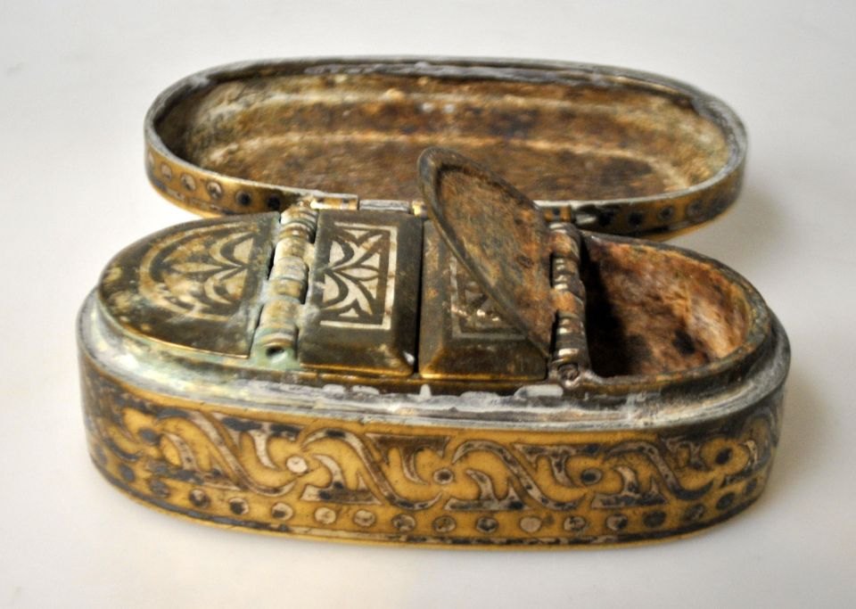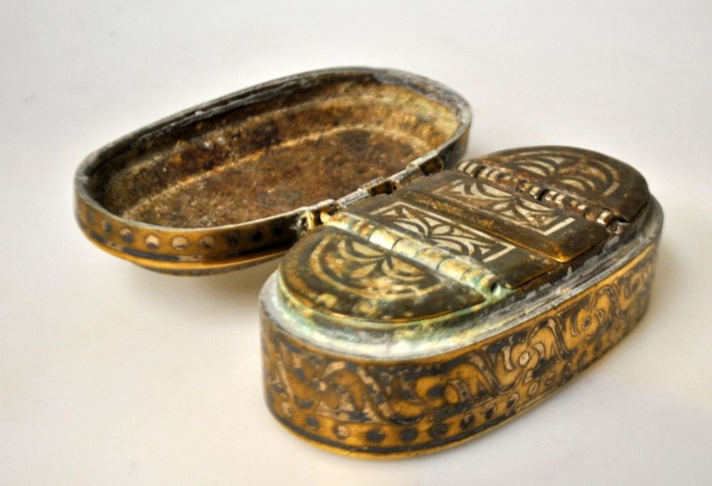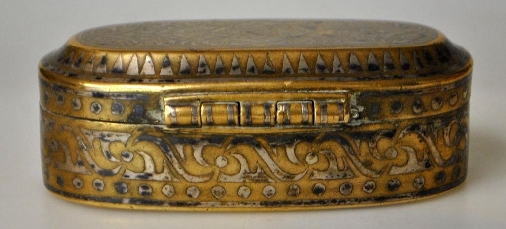 Asian container for betel and burnt lime, 19th century. Brass with inlaid silver in patterns. Oval. L. 11.5 cm. W.: 5.7 cm. Height: 4 cm.