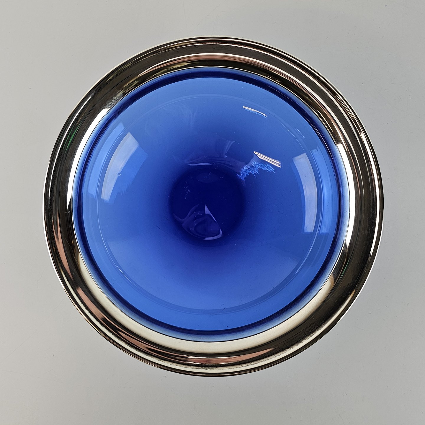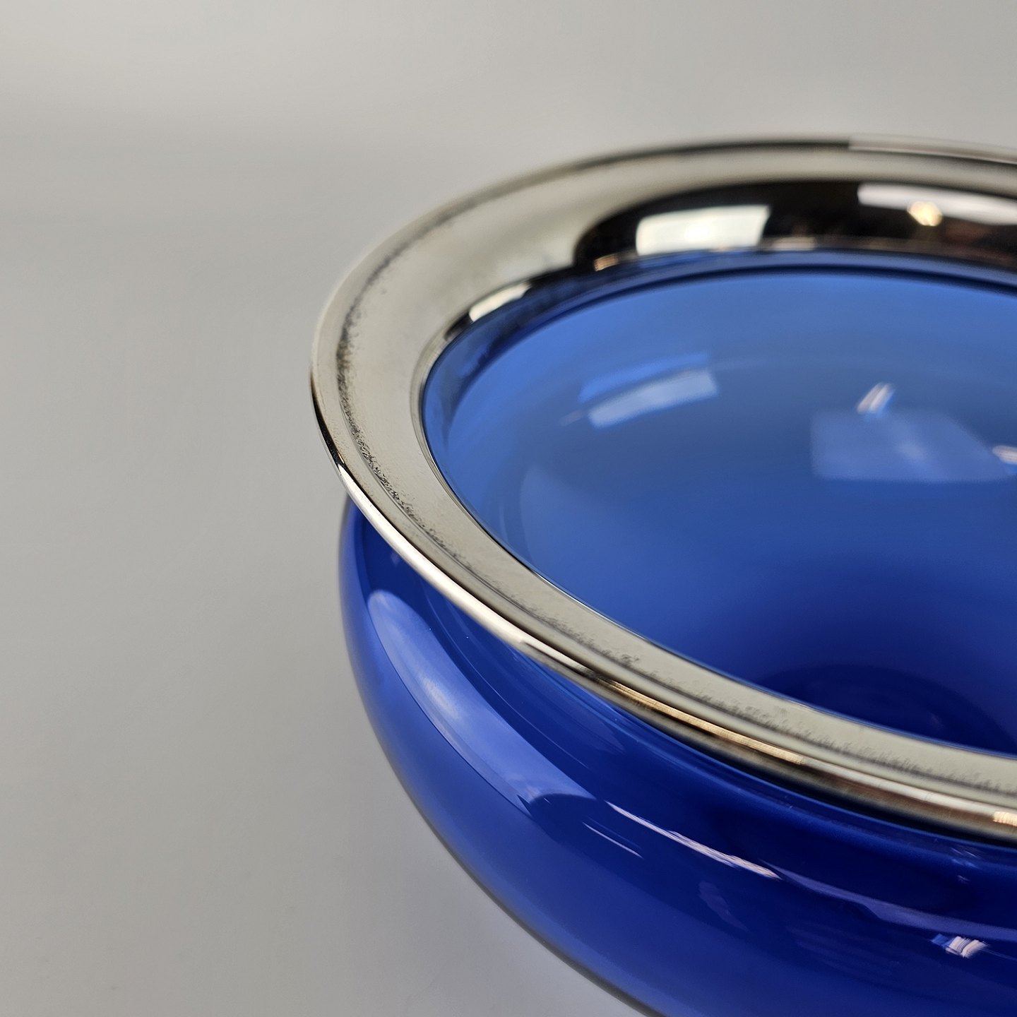 Mundblæst glasskål i blå, kanten er dyppet i sølv. Fra serien Saturn