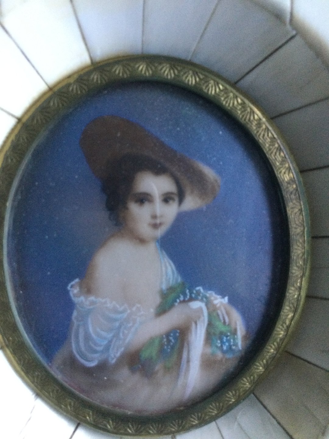 Miniature portræt i benramme - Portræt af smuk ung kvinde med hat og frugtkurv.