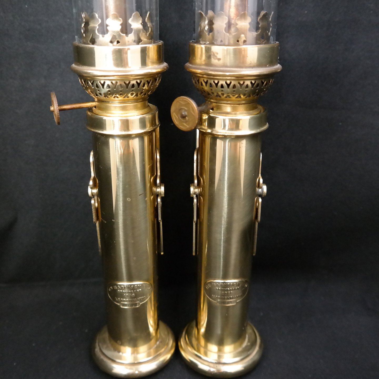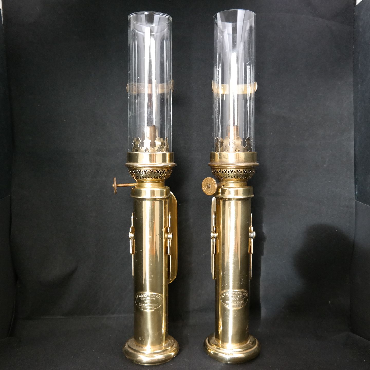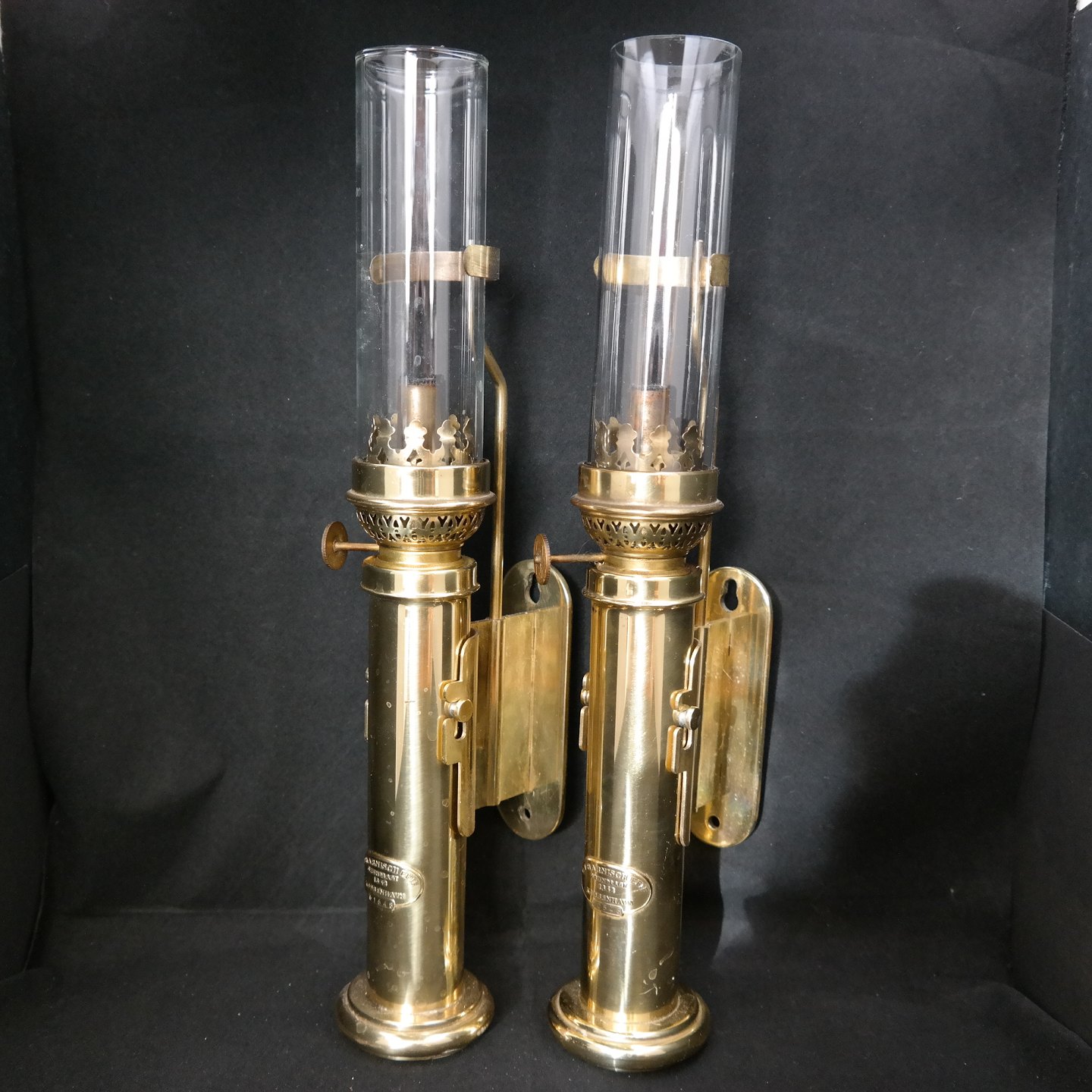 Text available in Danish: Olielamper / skibslamper af messing og glas, Væghængte.