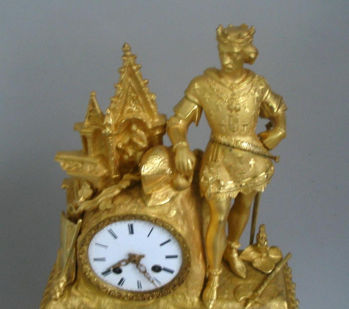 French empire mantleclock of gilded bronze, richly molded with peacocks, flowers and rococo wall fountain. At the top a royal character is standing at a Catholic tabernacle. Next to the king different war attributes. White enamelled dial with Roman numeral 19th century. With cord hanging. H: 53 cm. Fantasticly beautiful condition.