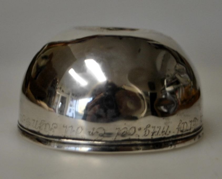 Silver tumbler, wedding cup 1753, Denmark. On the edge the text: "W. .... Folch that's my name. Drink to me. that's your Gafn, anno 1753". Height: 3 cm. Dia.: 5.4 cm. The bottom is engraved with the letters: PW - the master's name. Really rare! Tumblers are brandy cups.