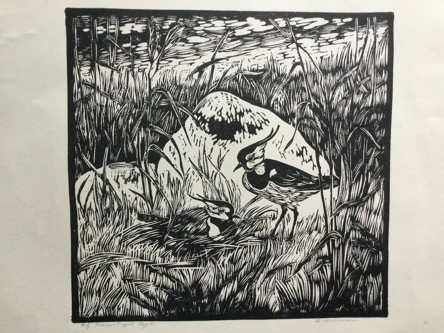 Træsnit af Svend Mussmann - Viber i landskab.