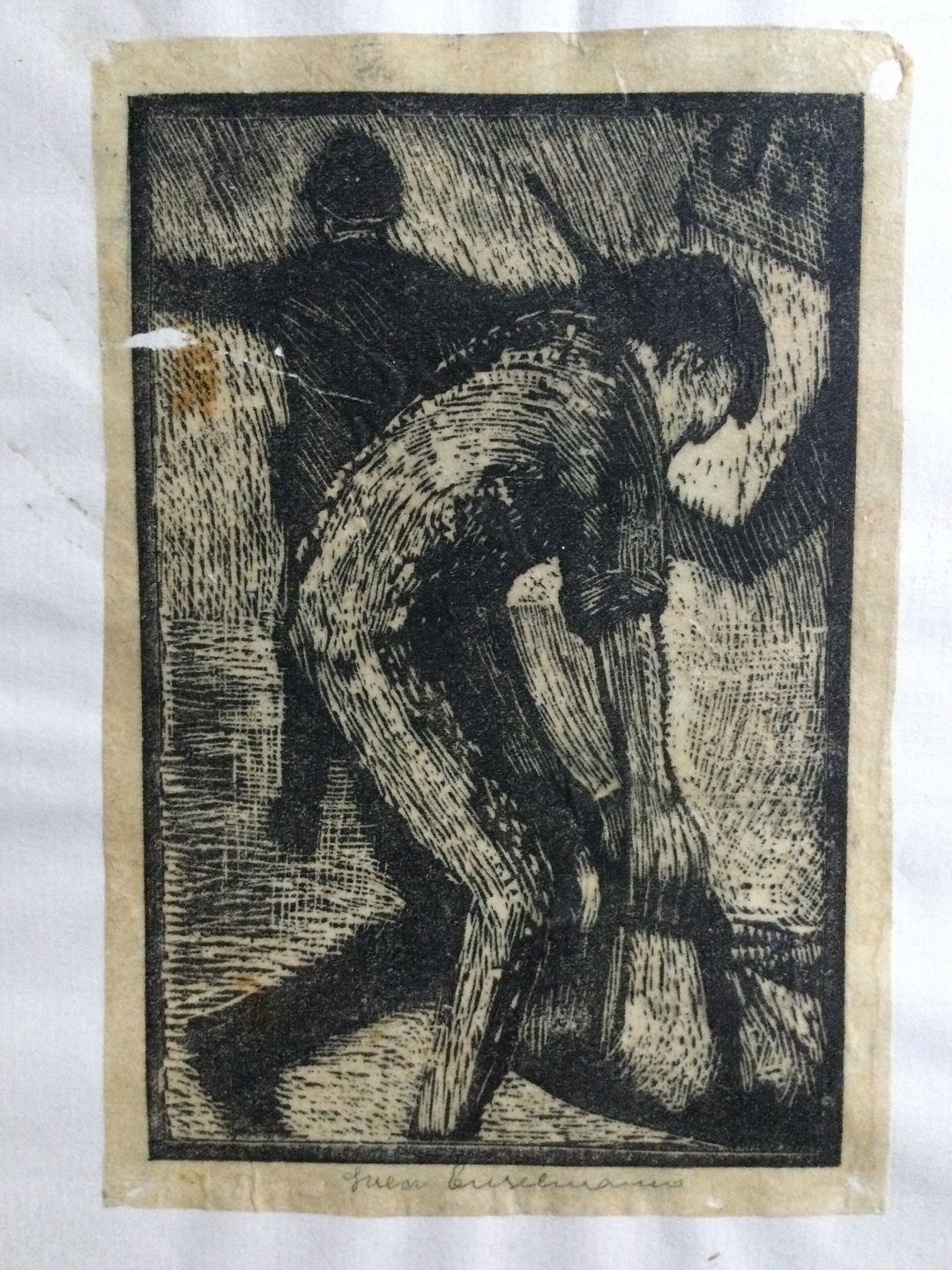 Træsnit af Sven Enselmann - 2 personer i landskab.