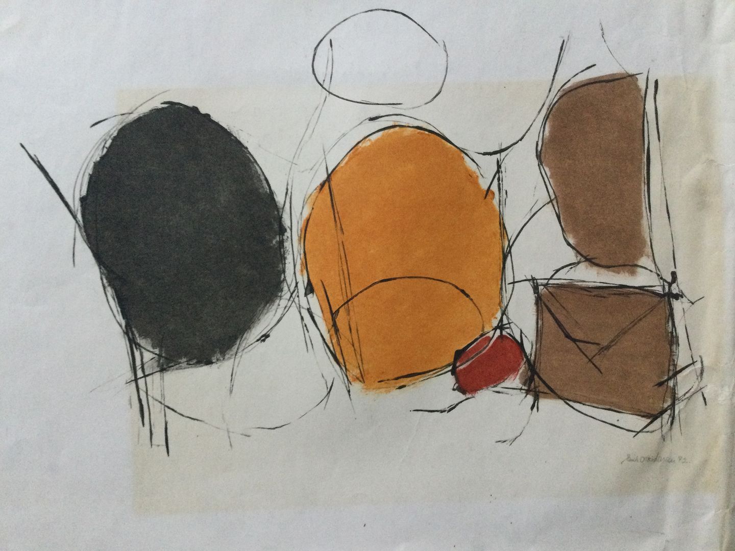 Litografi med efterbehandling af akvarel og farvekridt på papir.