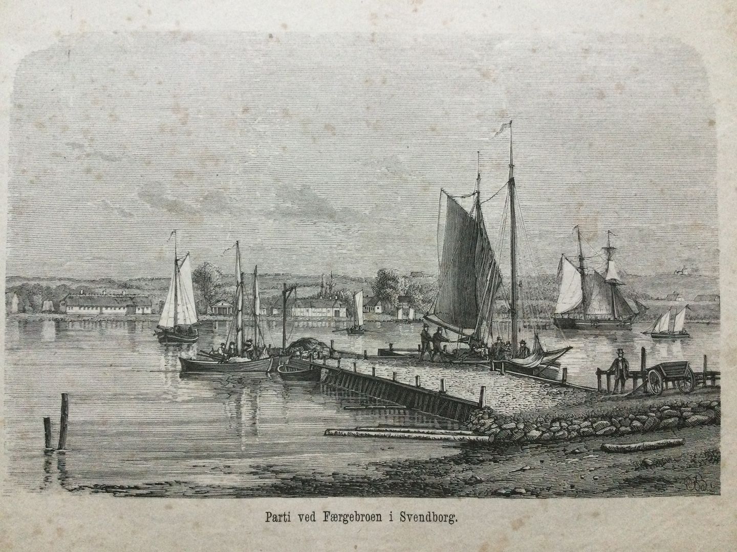 Text available in Danish: Xylografi af Carl Emil Baagøe - Vindeby overfartens leje i Svendborg.