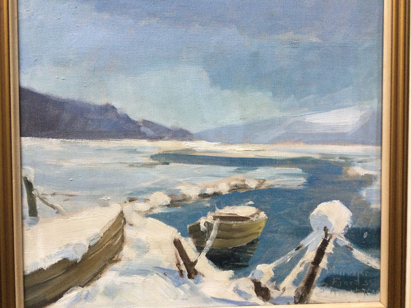 Maleri af E. Thorbjørn 1955 - Vinterparti fra Mariager Fjord.