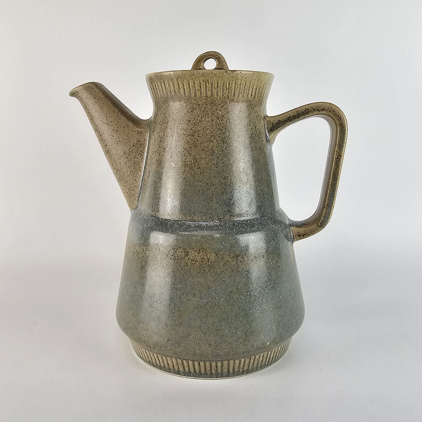 Kande af stentøj og dekoreret med en grønlig nuance glasering.