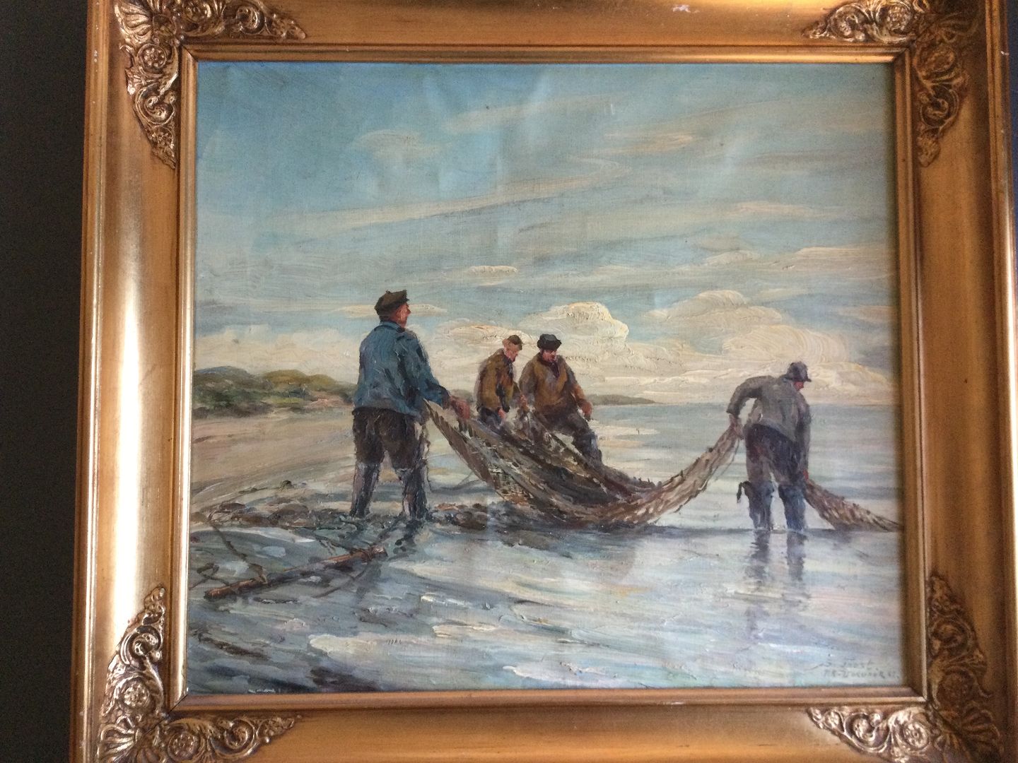 Maleri af Sergius Frost - Der trækkes vod på stranden efter makrel, Nr. Vorupør 4. august 1955.