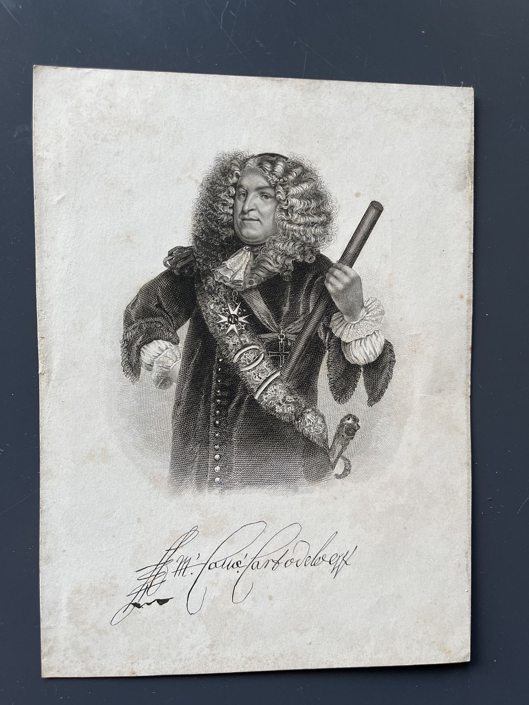 Text available in Danish: Kobberstik - Portræt af Generaladmiral Cort Sivertsen Adeler.