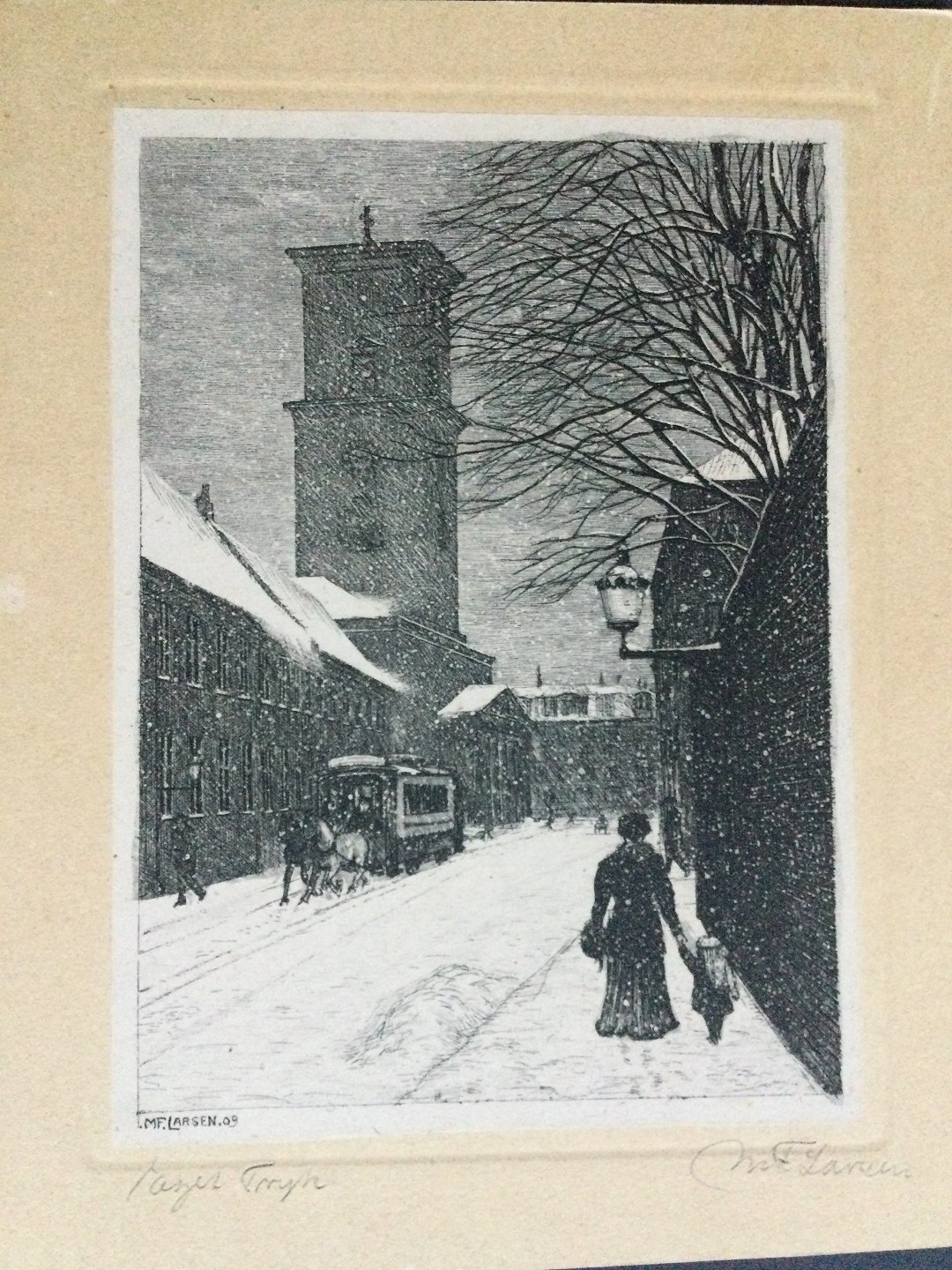 Radering af Martin F. Larsen - Vor frue Kirke i København, Vinter 1909.