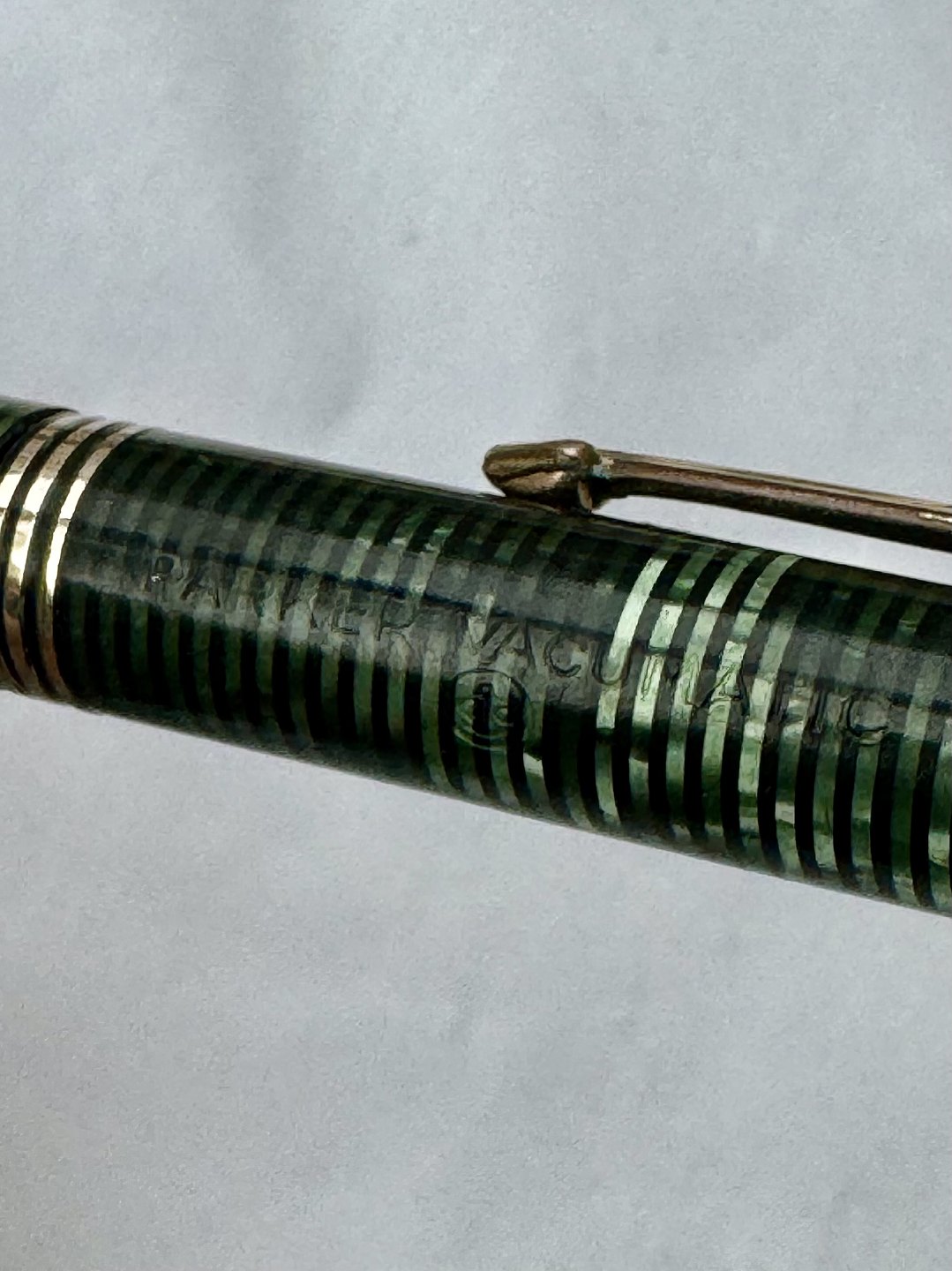 Grønstribet Parker Vacumatic skrueblyant I fin stand. Alle dele originale. Ingen skader eller reparationer. Indgraveret personligt navn. Klar til at blive brugt. L. 13 cm