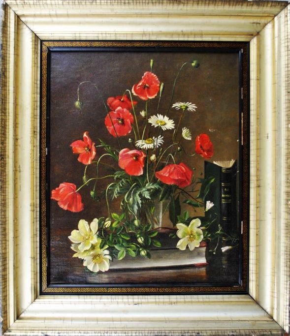Vistoft, Marie, 19th century: Arrangement with flowers and a book.