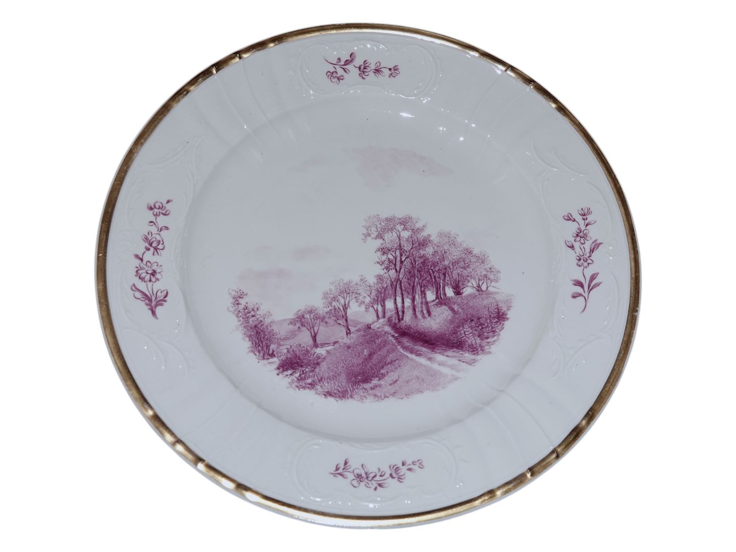 Royal Copenhagen Purpur Blomst Juliane Marie med guldkant, middagstallerken med landskab. Der er hul til ophæng.