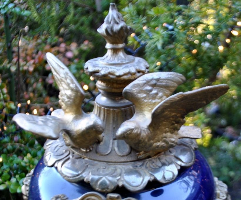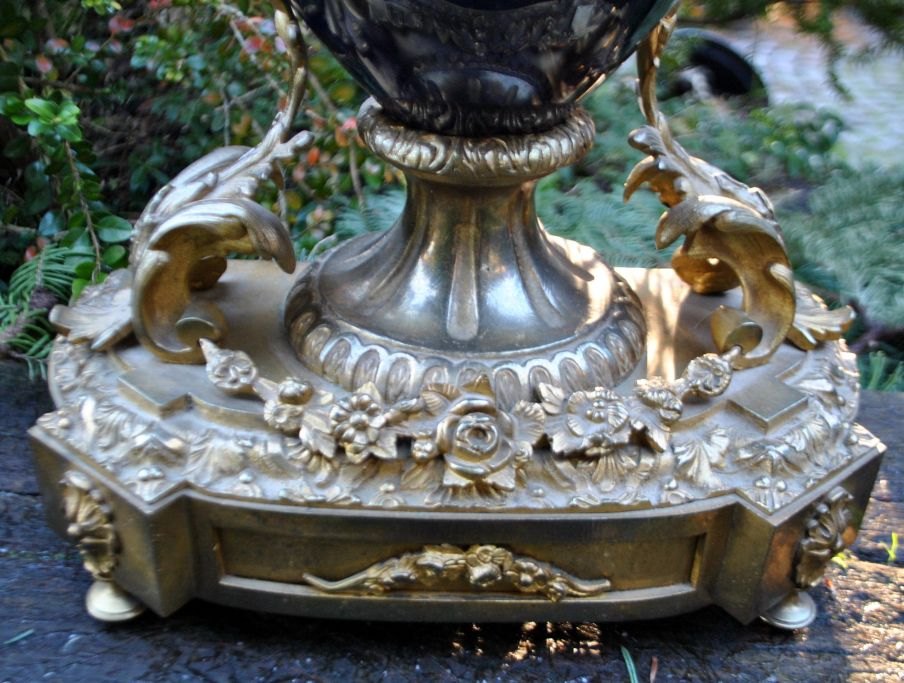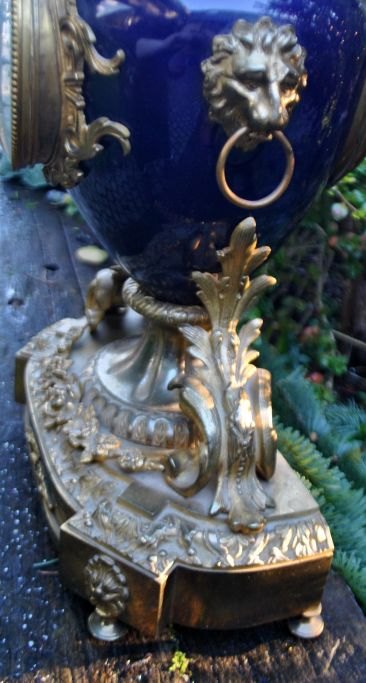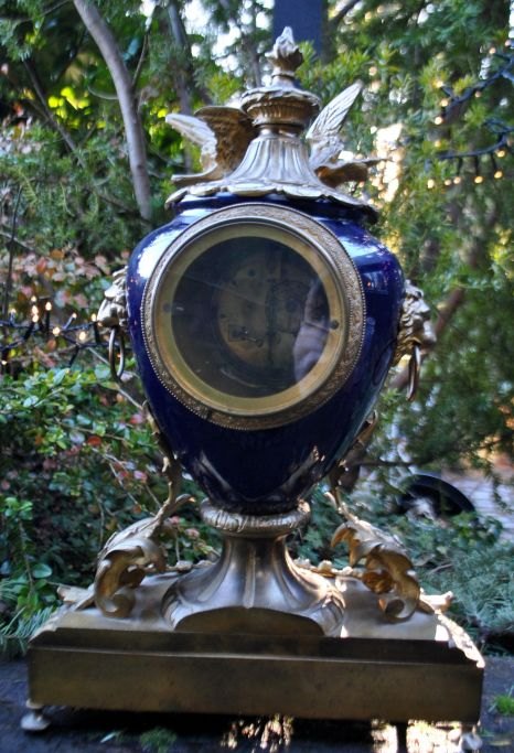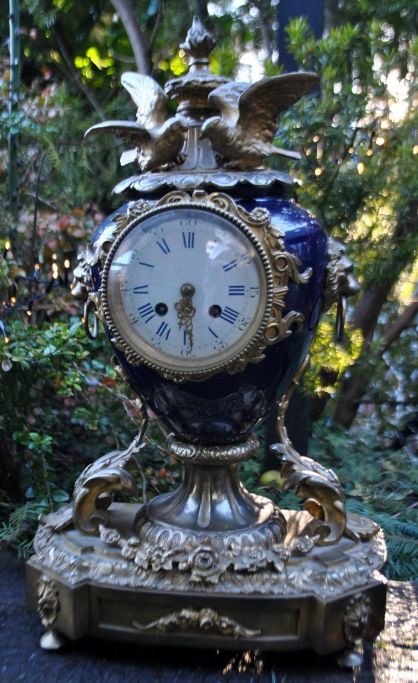 Mantel clock with gilded bronze, 19th century. France. Clock case in cobalt blue porcelain. Base with flower tendrils. On clock case two lion heads. Top figure of two birds. H.: 50 cm. W.: 31 cm. Dial in white enamel with Roman and Arabic numerals.