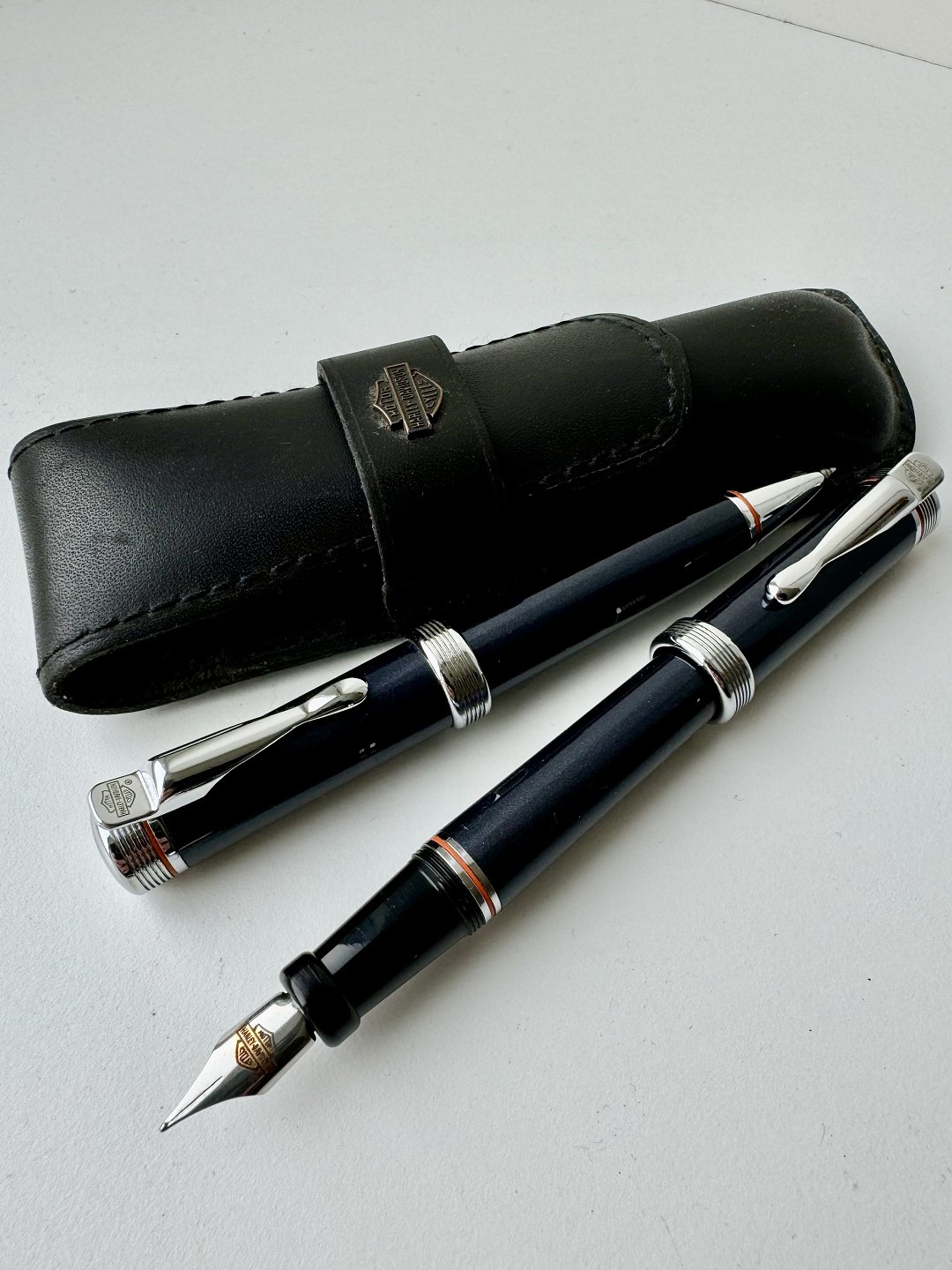 Blå metalic Harley Davidson skrivesæt - Fyldepen og kuglepen i originalt tilhørende futteral. Kuglepennen virker men der skal indsættes ny blækpatron før end fyldepennen virker. Alle dele originale og i god stand. L. 12,3 cm