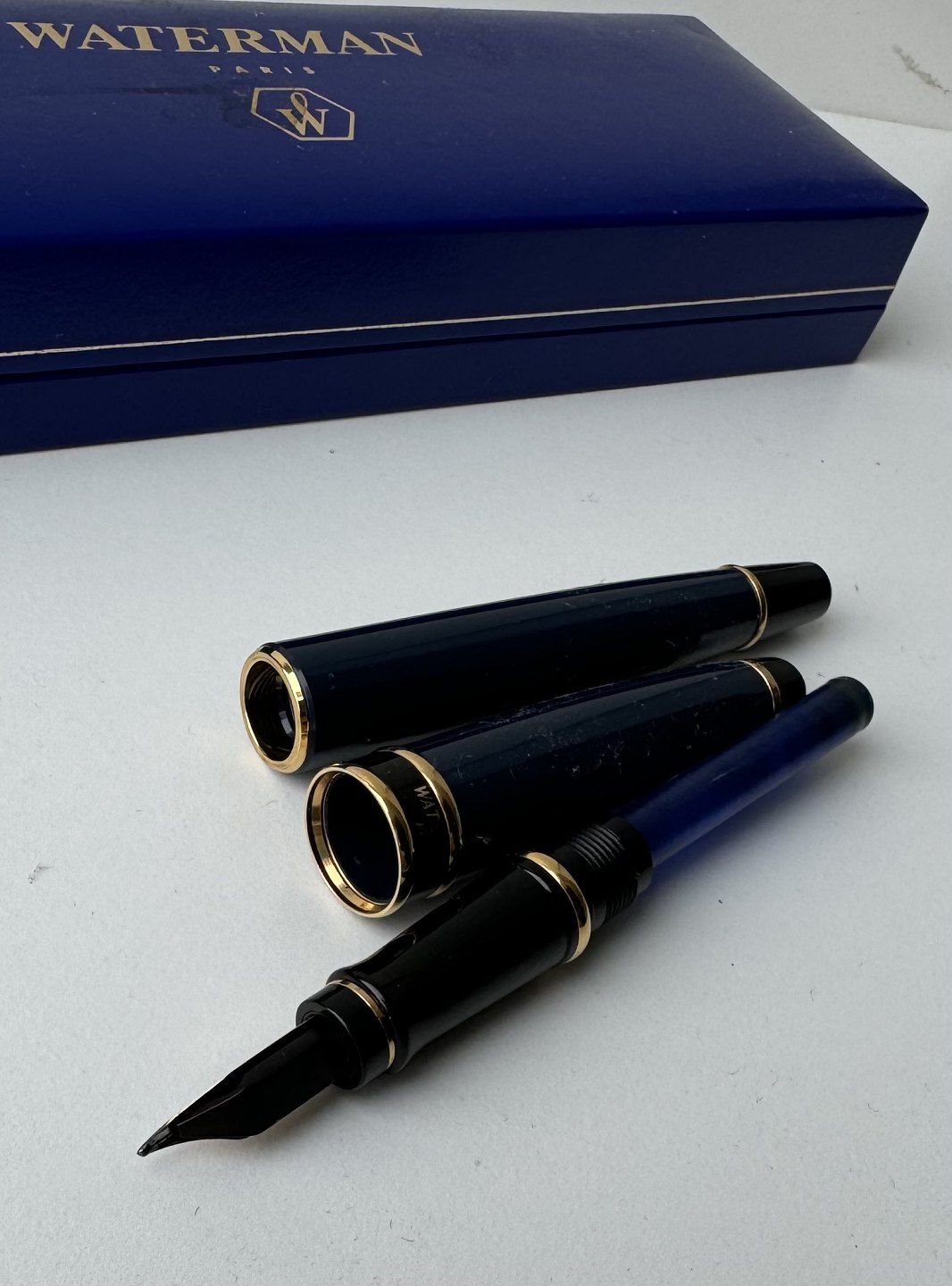 Blå Waterman Expert Paris fyldepen. Fremstillet i Frankrig. Original tilhørende æske medfølger. Før end den igen kan skrive skal der tilkøbes ny blækpatron. Fremstår i god stand uden brugsspor. Fyldepennen er 14 cm lang.
