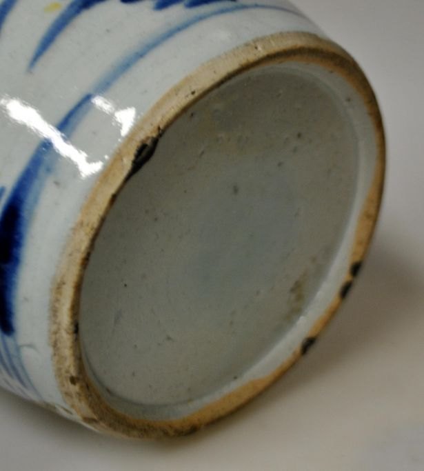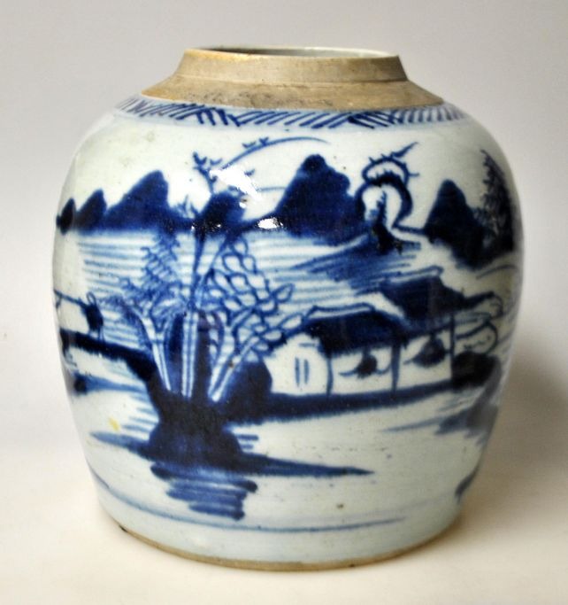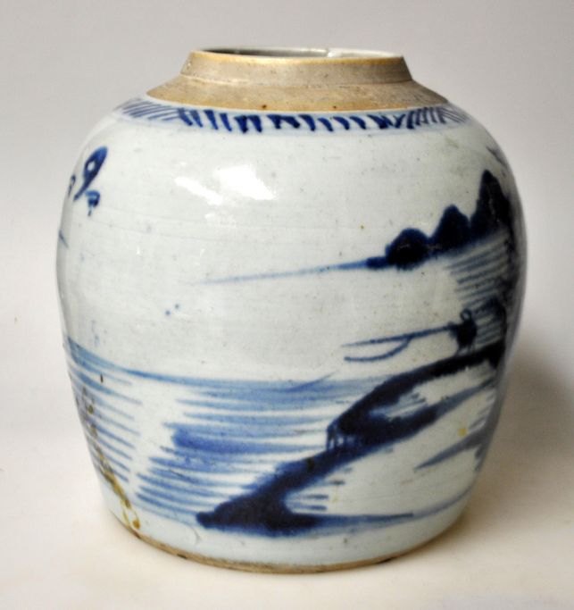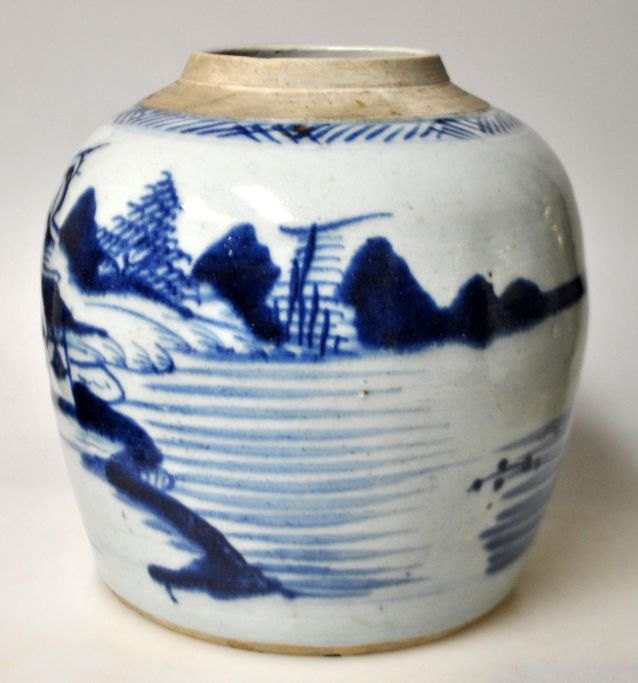 Kinesisk bojan uden låg. 19. årh. Blå/hvidt dekoreret med landskab. Ustemplet. Højde.: 16,5 cm.