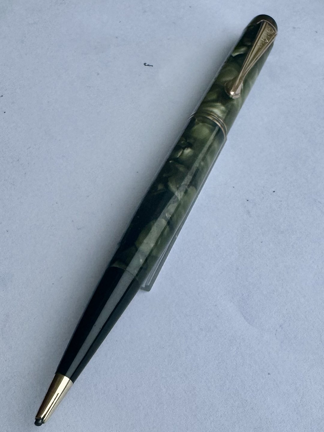 Grøn marmoreret Big Ben skrueblyant. I god stand. Ingen skader eller reparationer. Klar til at blive brugt. Indgraveret Big Ben på clipsen samt personligt navn på pennen. L. 13 cm