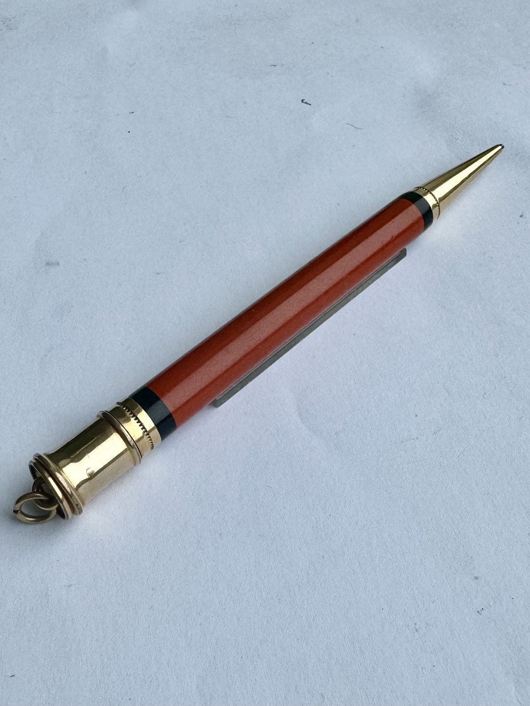 Koralrød Parker Duofold skrueblyant fra 1930’erne. Messing top med øsken. Fremstår i god stand. Klar til at blive brugt. L. 11,5 cm