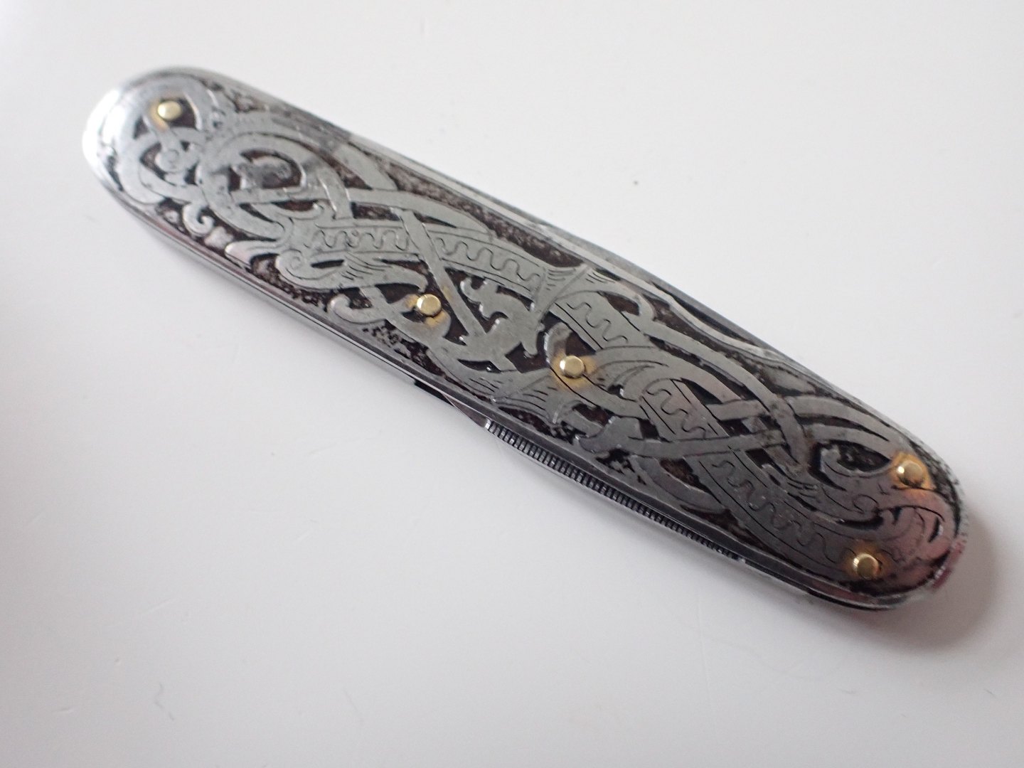 En svensk vintage stålkniv fra Ôsterberg CV, Eskiltuna (1861 -1949) med 2 korte og en lang klinge, den ene korte med neglefil. Dekoreret med sort emalje med det svenske rigsvåben omgivet af vikingeslyngninger på begge sider. Længde udslået: 15 cm. Sammenslået: 7,5 cm. Den alleryderste spids på den ene lille klinge er gået af ellers i pæn stand. Pris: 225 kr.