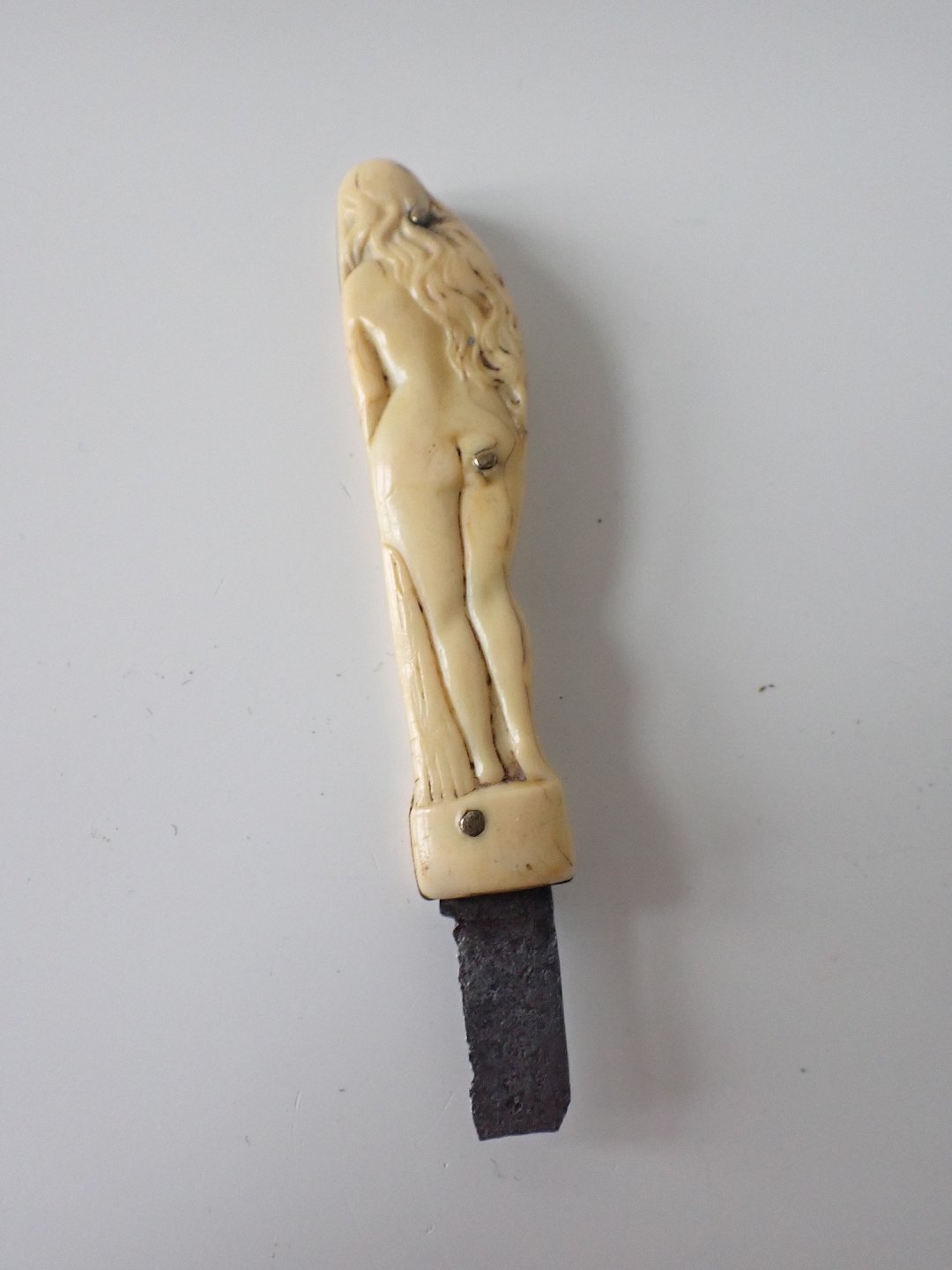 En gammel knækket lommekniv med fint udskåret ben skaft på begge sider af nøgen kvindefigur. Ca. 1900.Rest af knivblad: 1,8 cm. Sammenslået: 6,5 cm. Figur i pæn stand med en del brugsslid. Solgt.